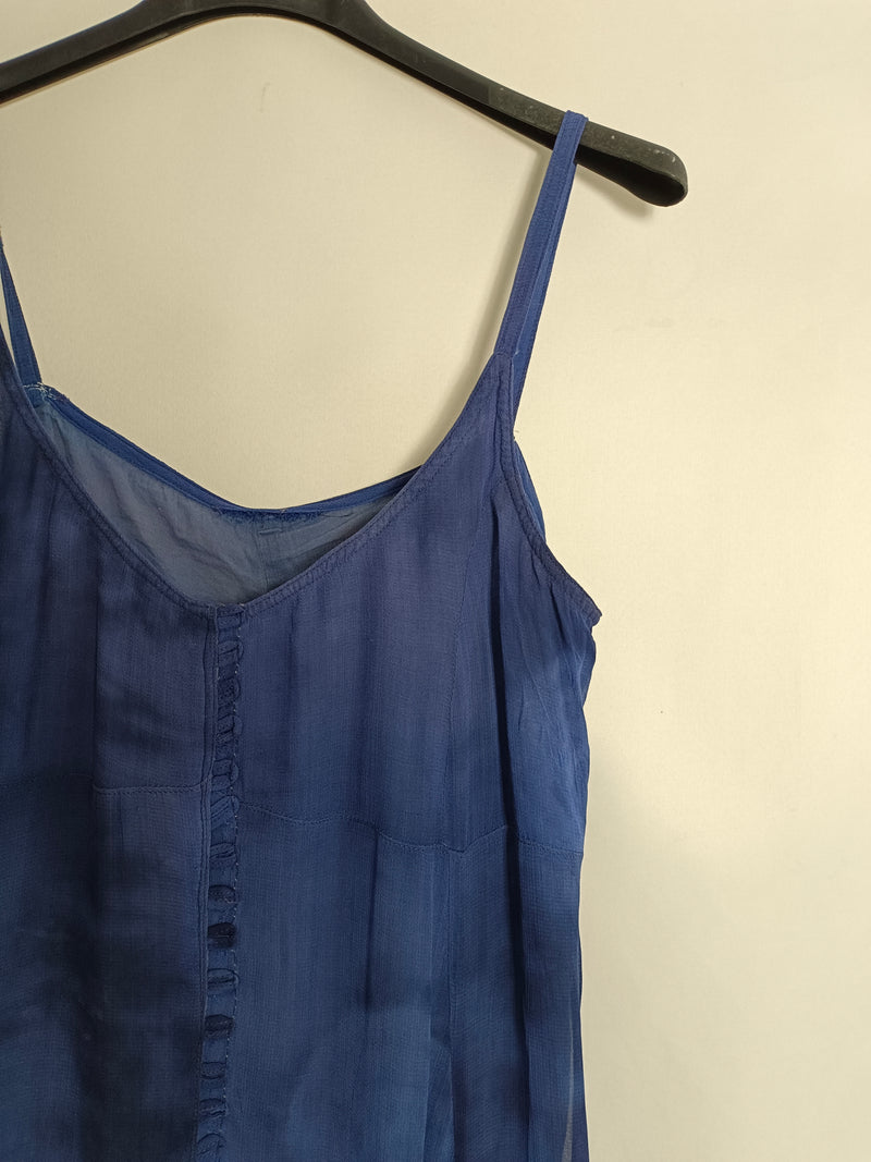 Vestido midi azul efecto tie dye. Apertura de delantera. Tara: dos mini manchas blancas e interior un poco desgastado