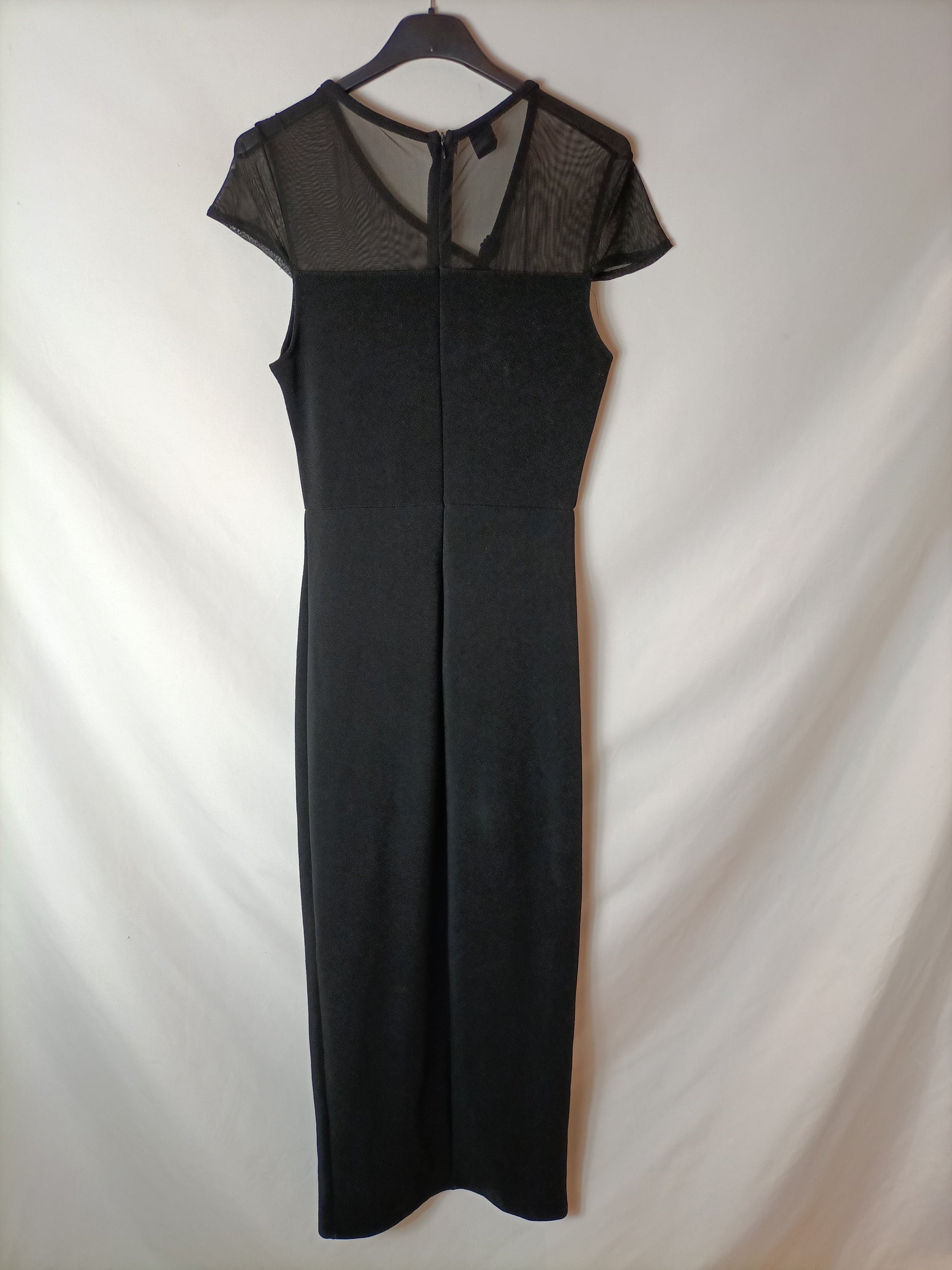 Vestido midi negro con detalle de botones estilo chino. hombros semitransparentes. elástico. largo 130 cm