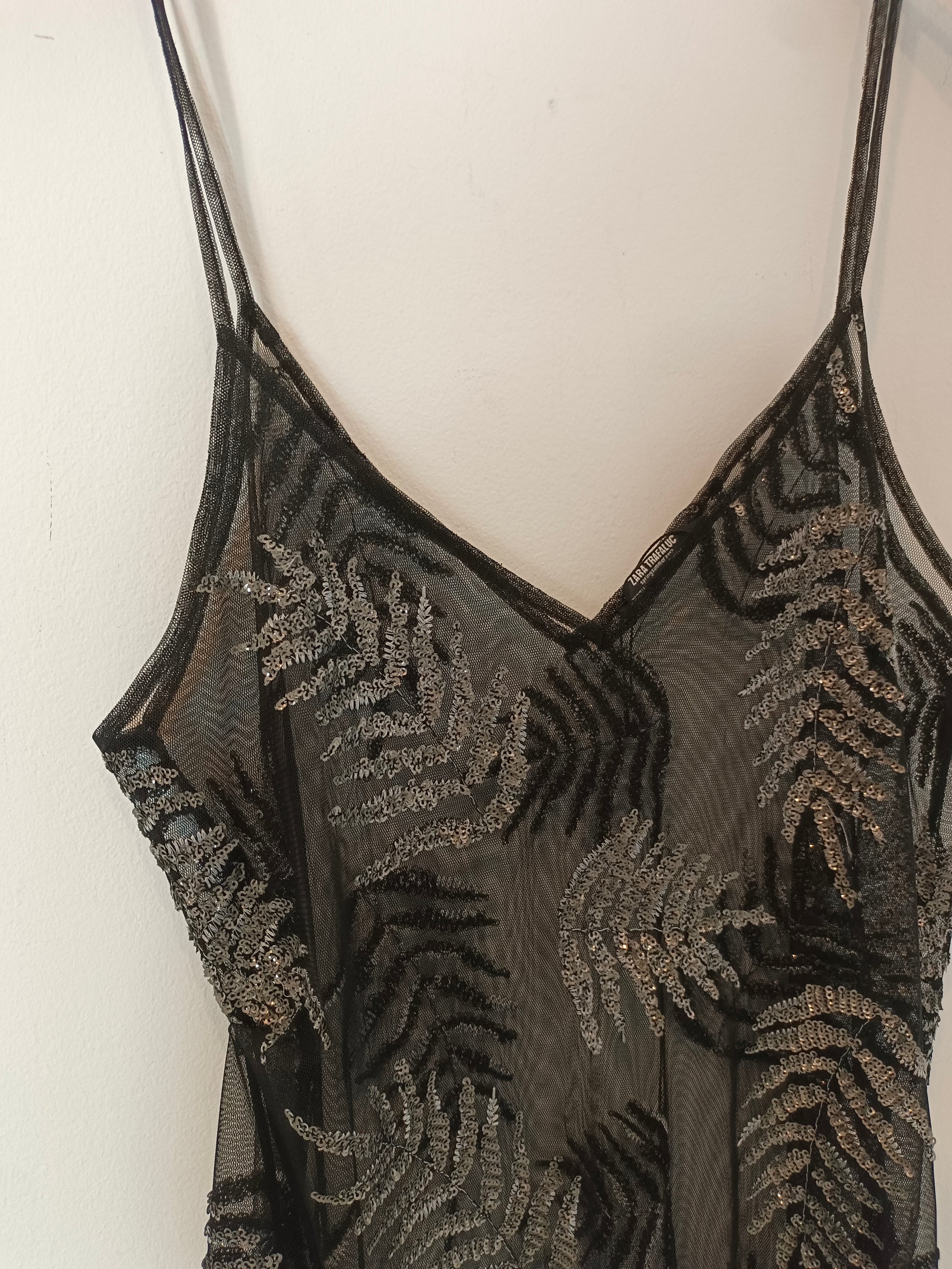 Vestido corto negro semitransparente con detalle de hojas el lentejuelas