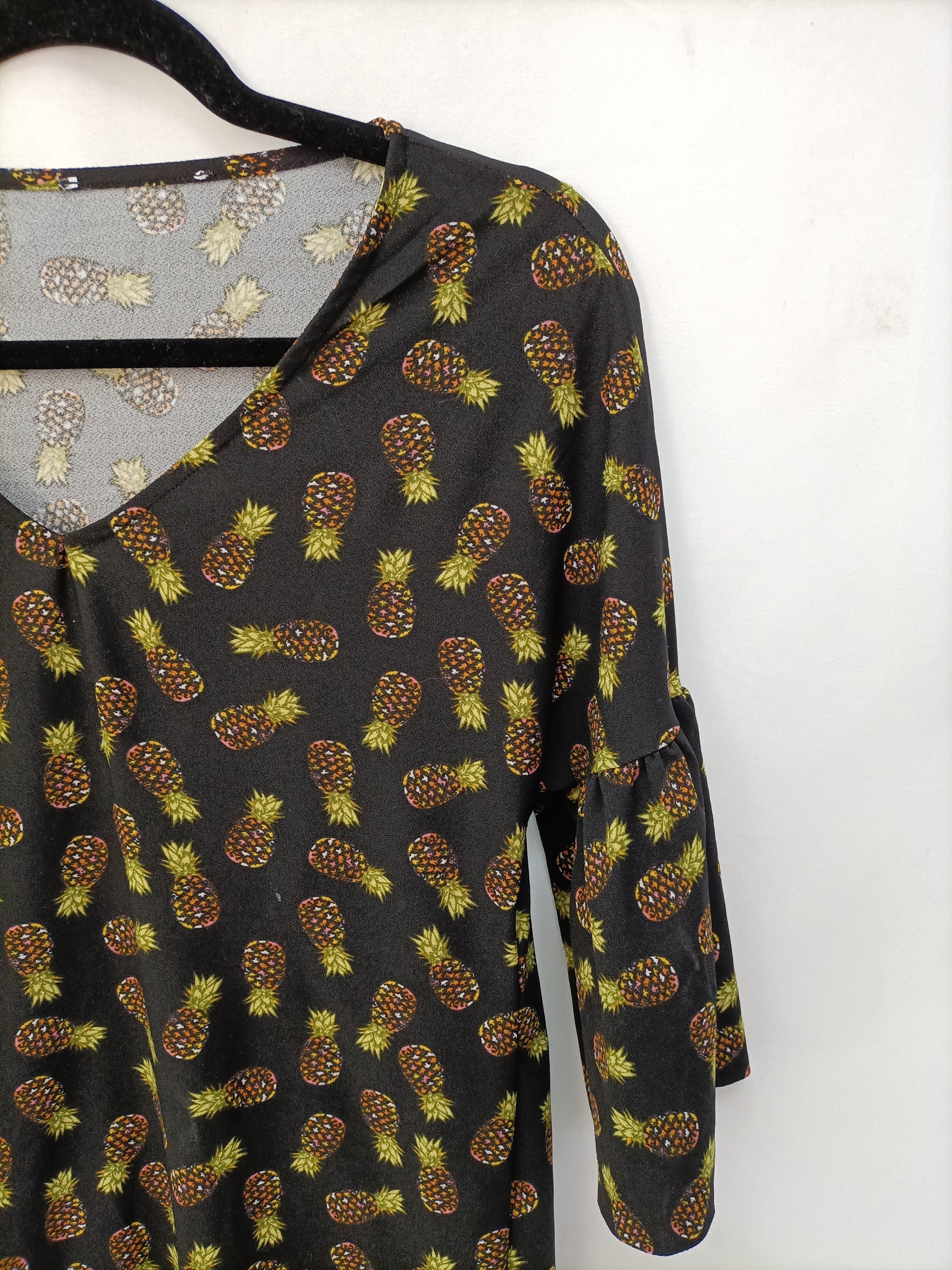 Vestido corto negro con estampado de piñas. Elastico. Volante en las mangas. largo 84 cm
