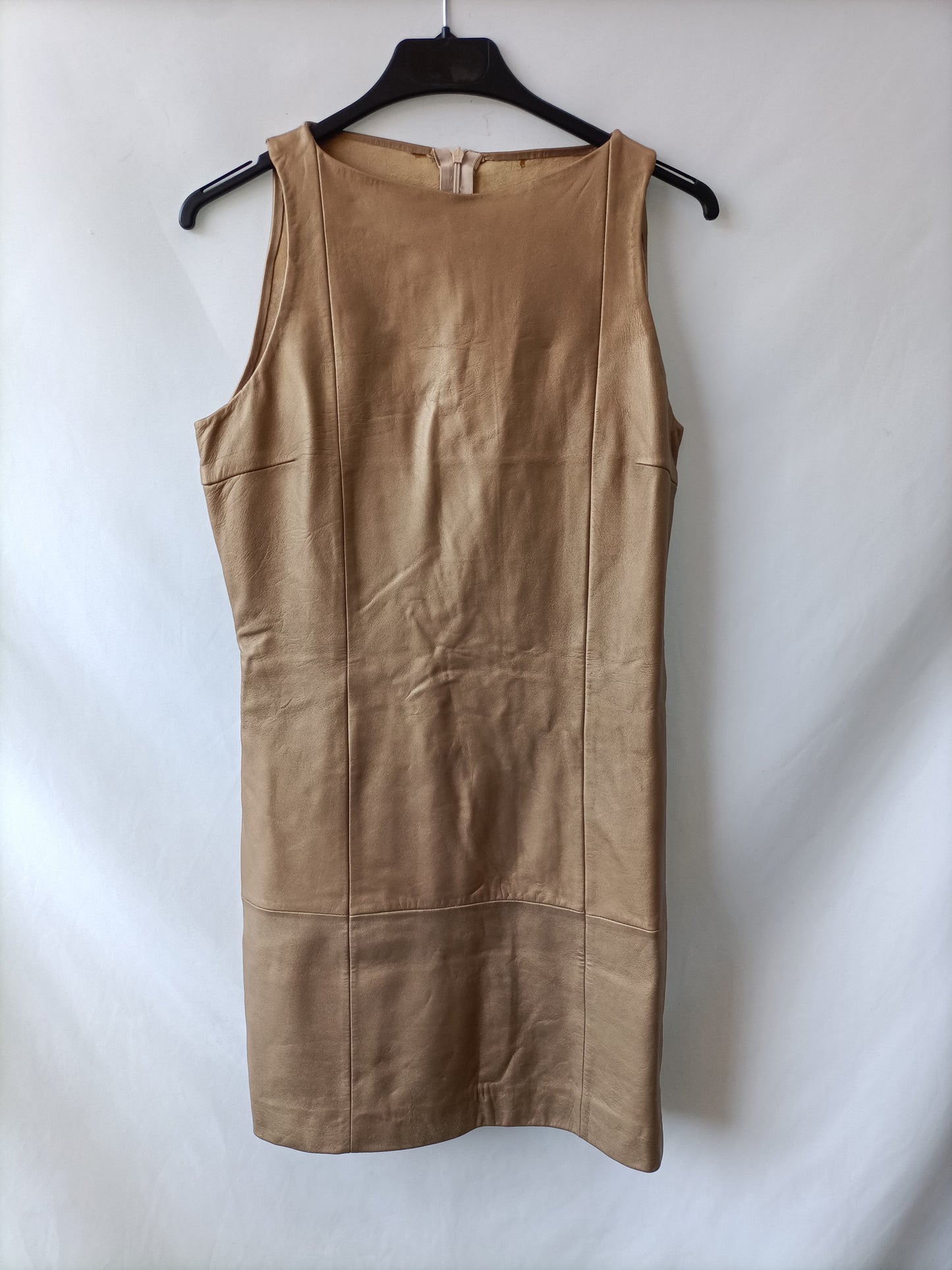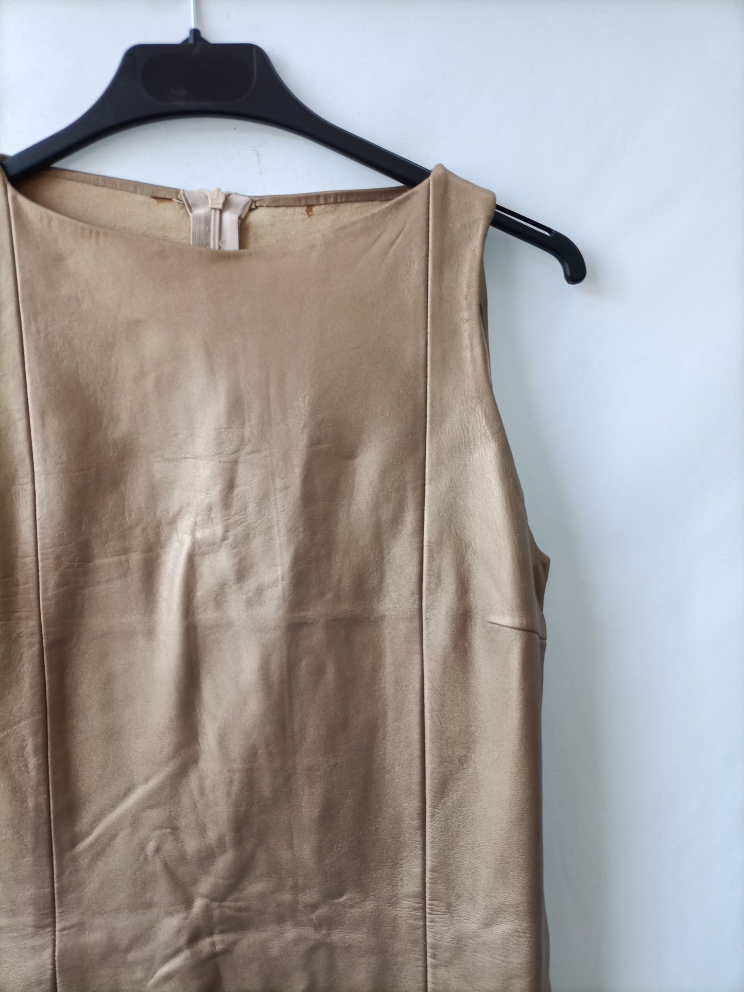Vestido de piel dorados. No es elástico. Se abrocha con cremallera. No elástico. De sisa a sisa 43 cm largo 83 cm