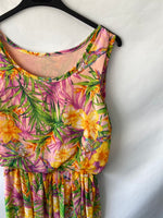 Vestido largo amarillo con flores tiene elástico en la cintura. De sisa a sisa 45 cm, Largo 123 cm
