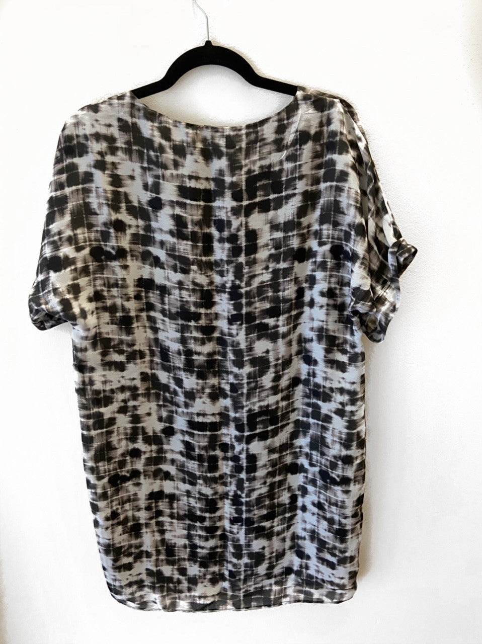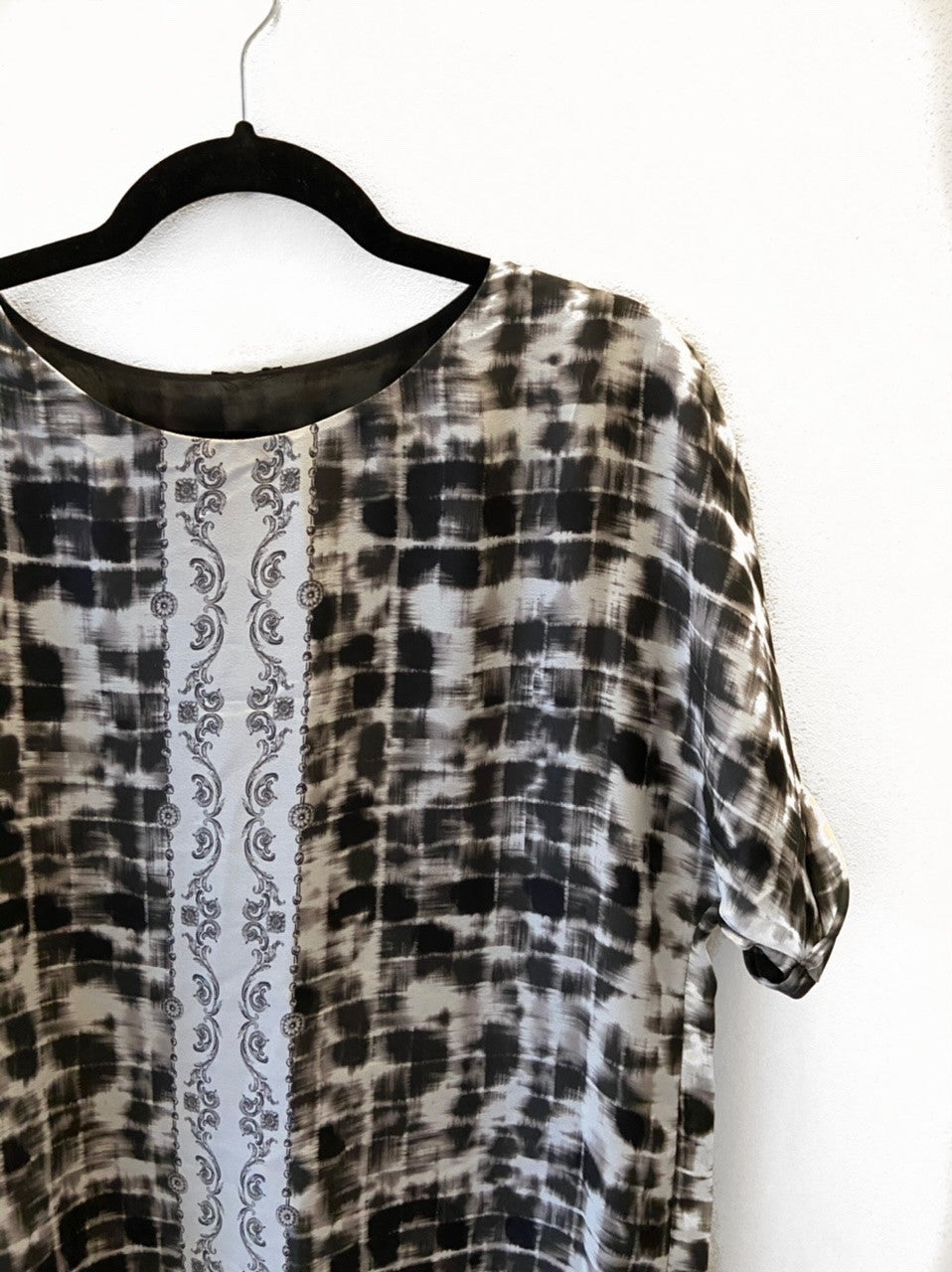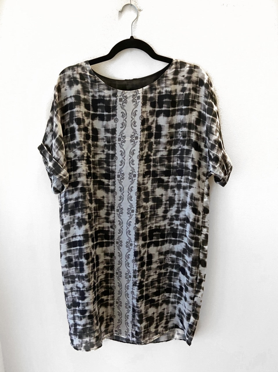 Vestido corto negro y gris estampado con detalles de flores en el centro, es fluido y fresquito, tipo oversized. De sisa a sisa 57 cm, largo 89 cm