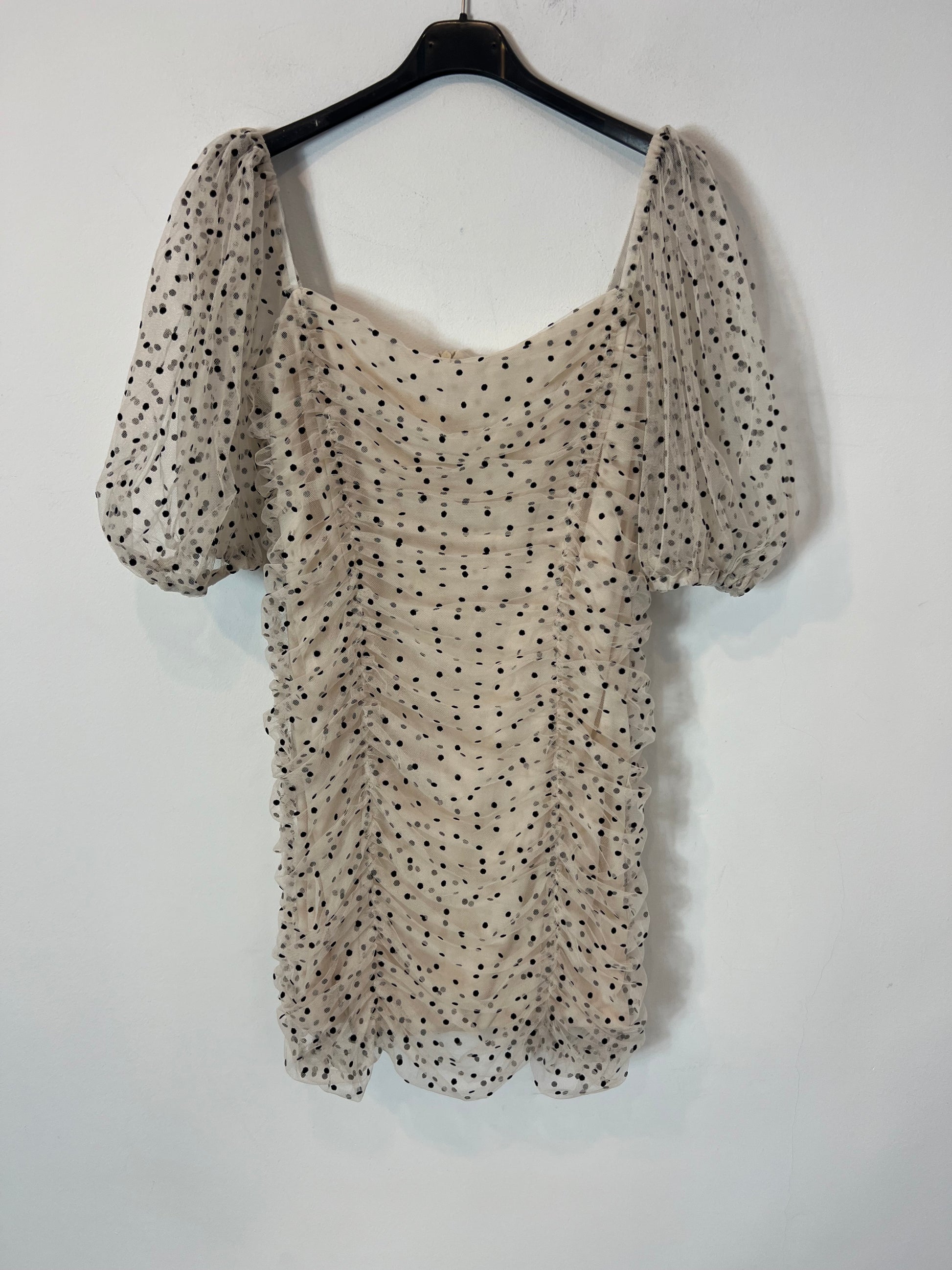 Vestido corto de tull beige con detalle de lunares negros y fruncidos. No elástico exterior, interior Semi elastico De sisa a sisa 37 cm largo 77 cm