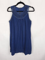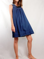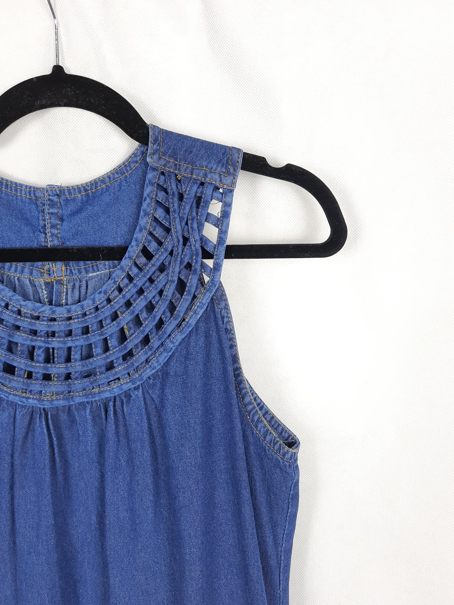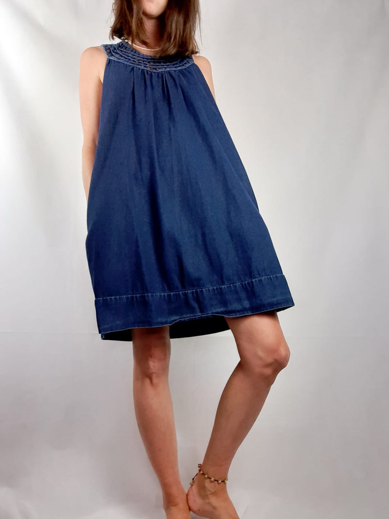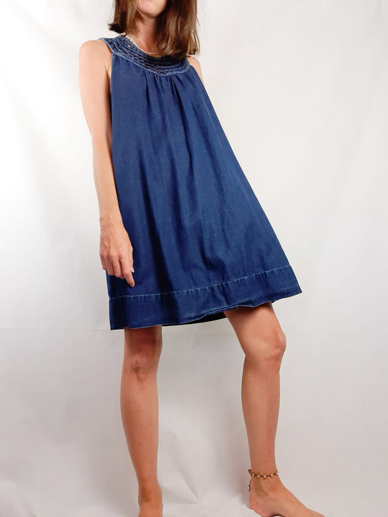 Vestido vaquero con el cuello trenzado. No es elástico y tiene bolsillos. De sisa a sisa 55 cm largo 88 cm