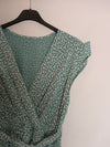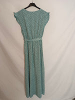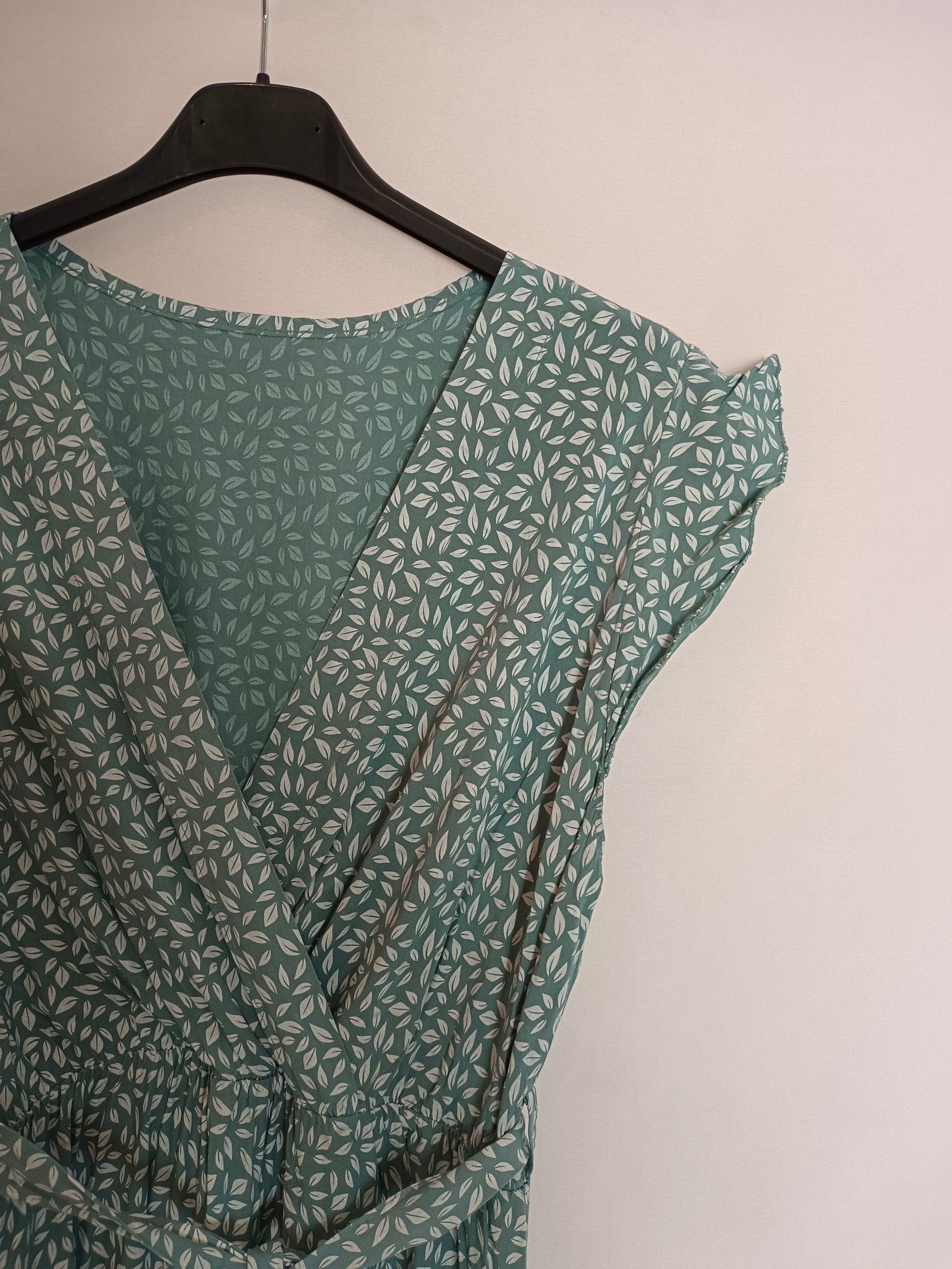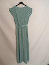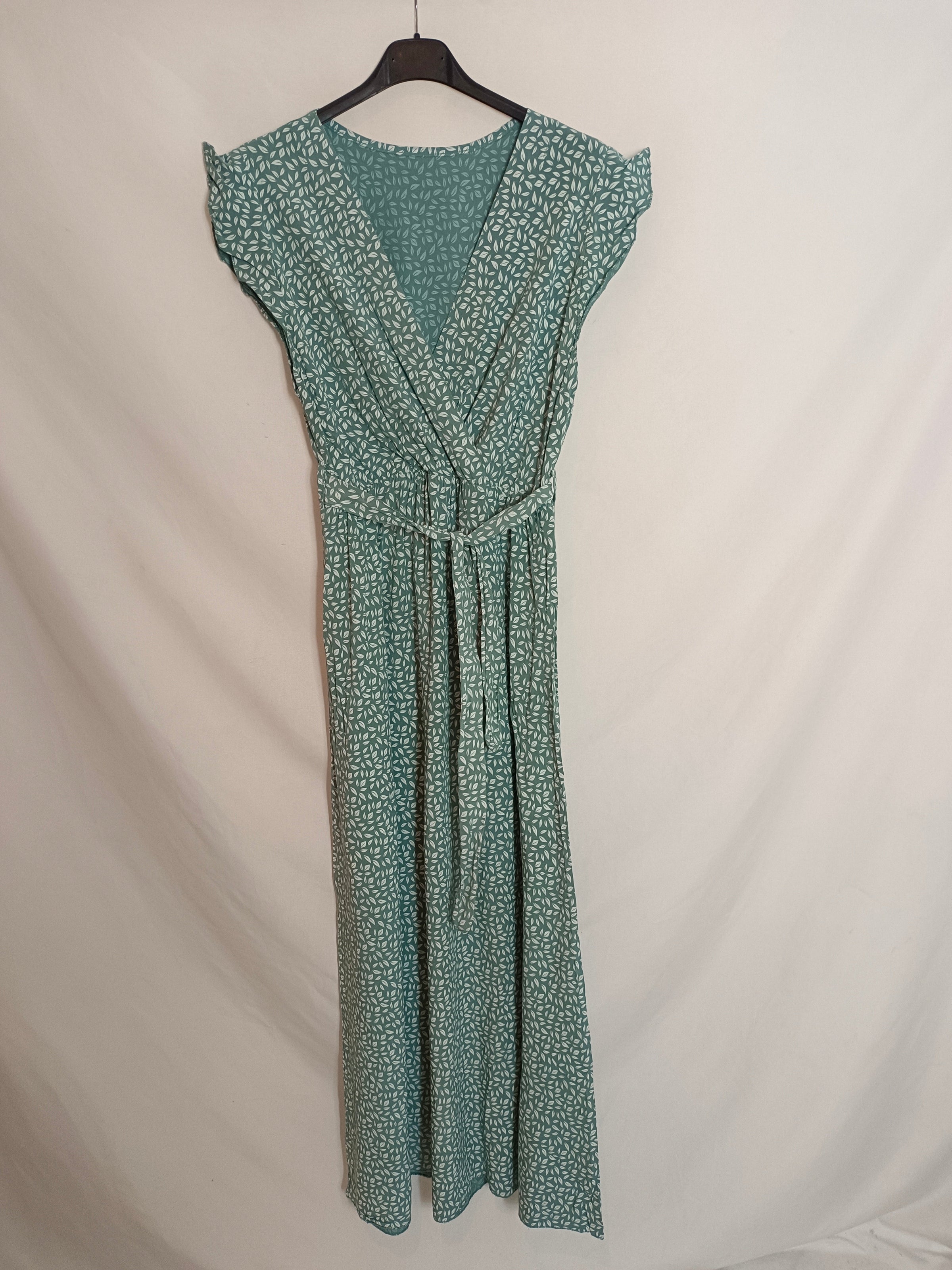 vestido largo verde azulado con estampado de hojas. Cintura elástica con lazada.