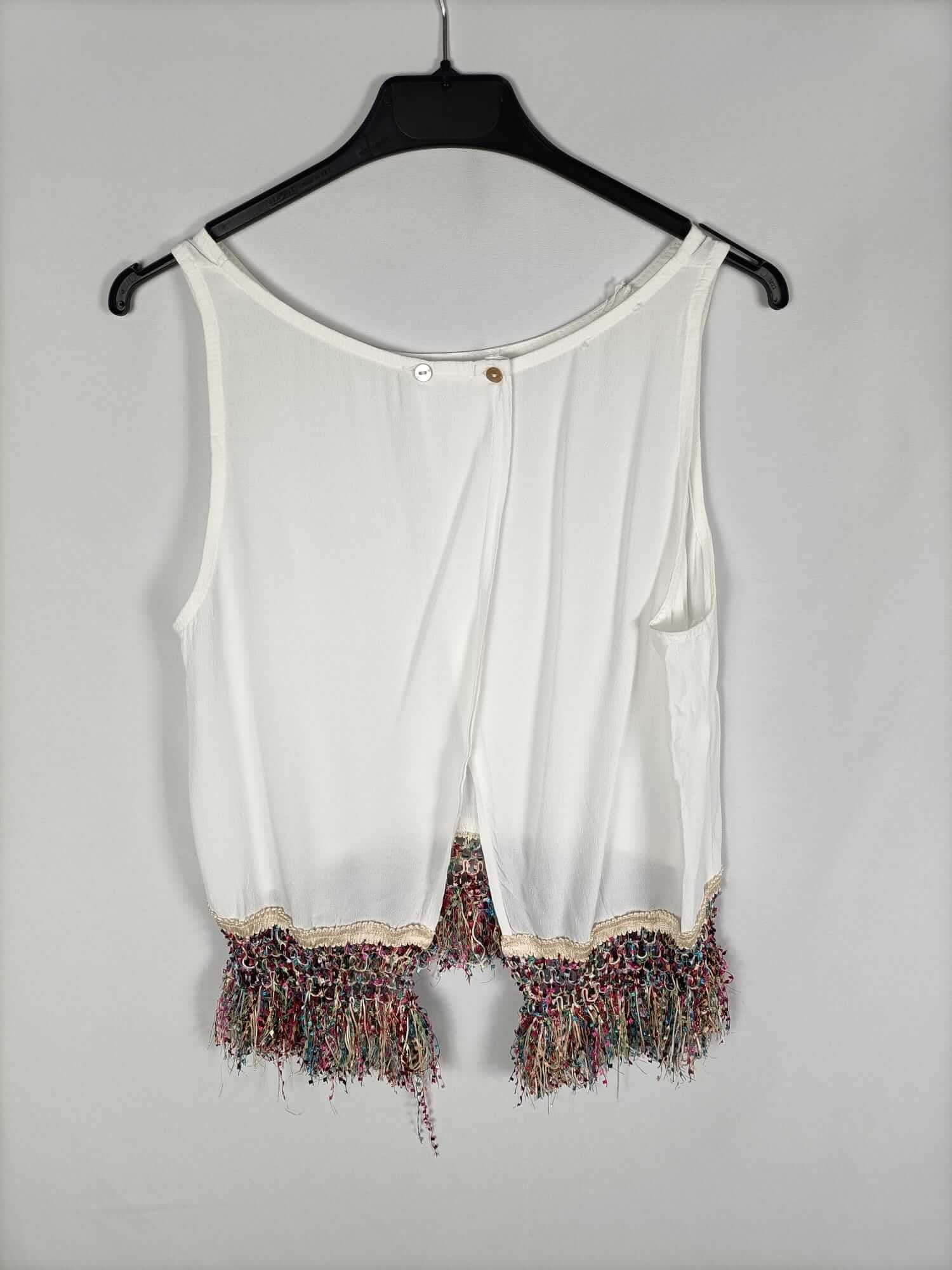 Otras. Tu (s/m). Blusa blanca con detalle de flecos de colores y espalda abierta. No elástica. De sisa a sisa 54 cm largo 59 cm