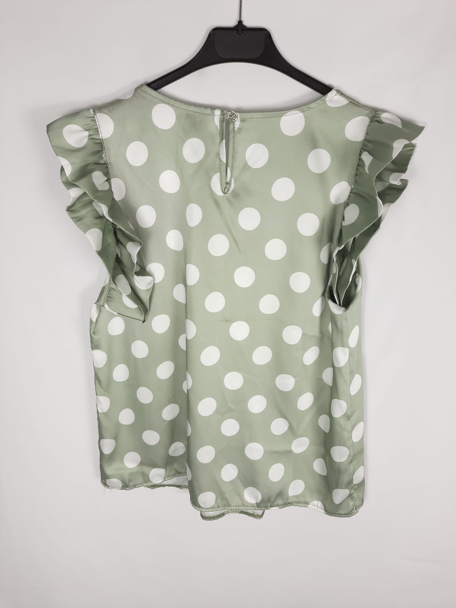 Otras. Blusa fluida verde con lunares blancos y volantes en las mangas. Pliegue delantero. De sisa a sisa 52 cm largo 60 cm
