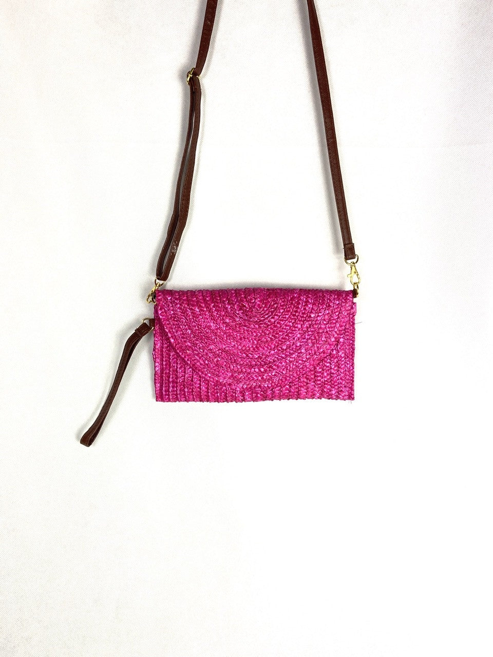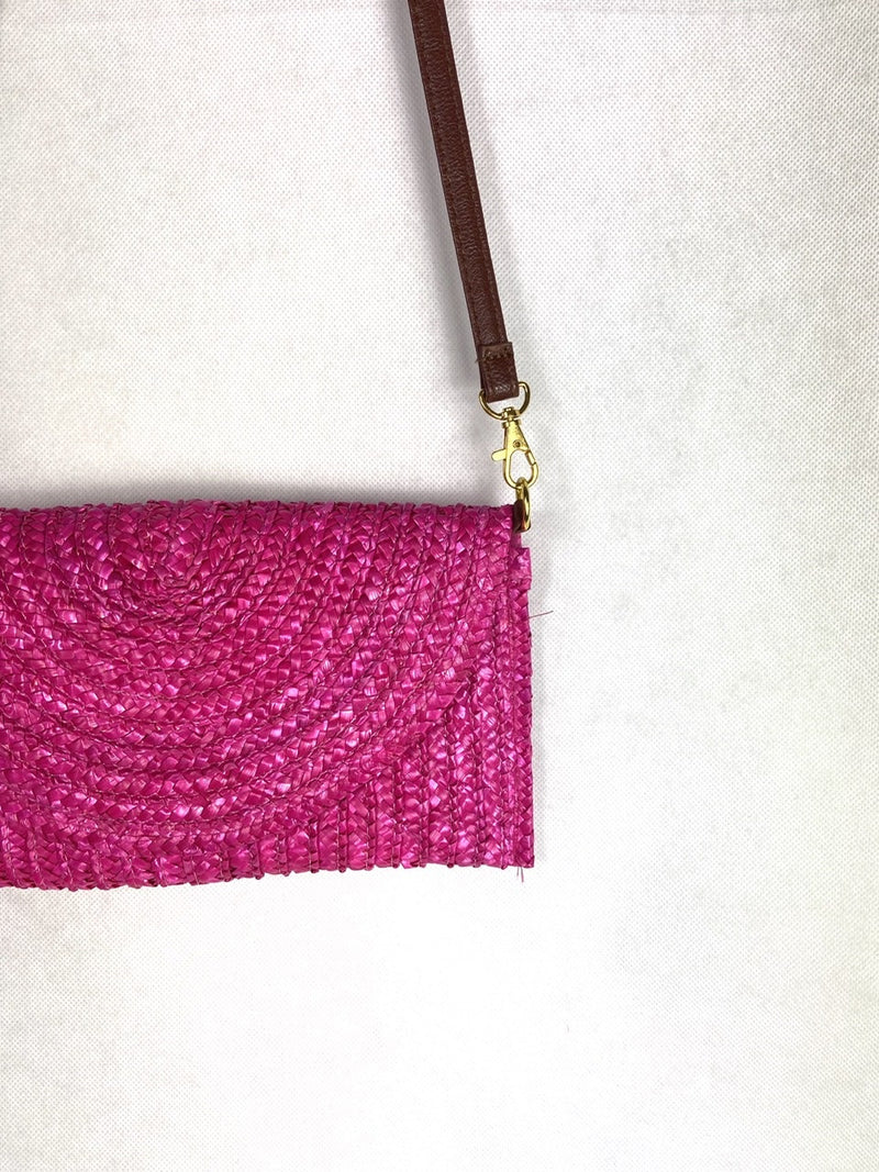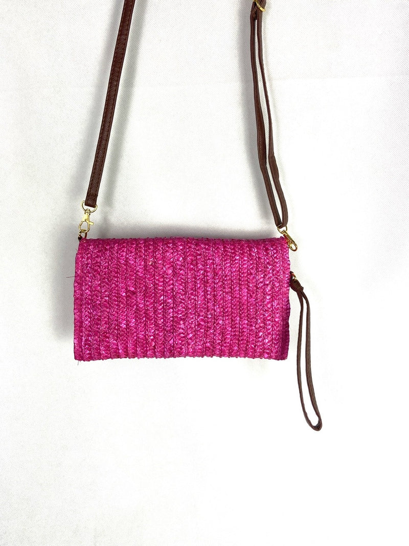 Bolso tipo cartera con correa extraíble en marrón y ajustable. Alto 16 cm, largo 18 cm y profundo 2 cm.