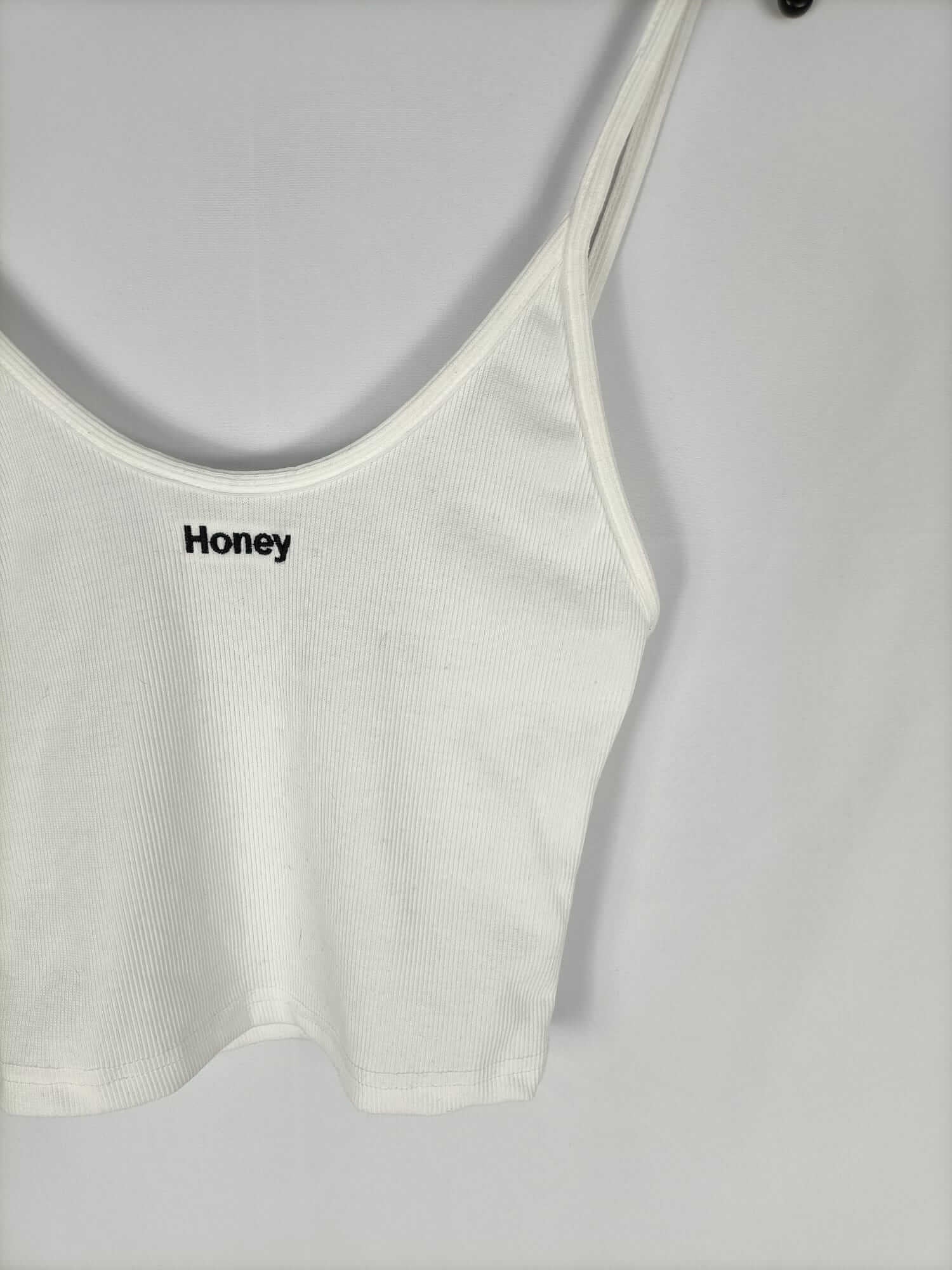 Top blanco de canalé elástico con "Honey" bordado. Largo 45 cm