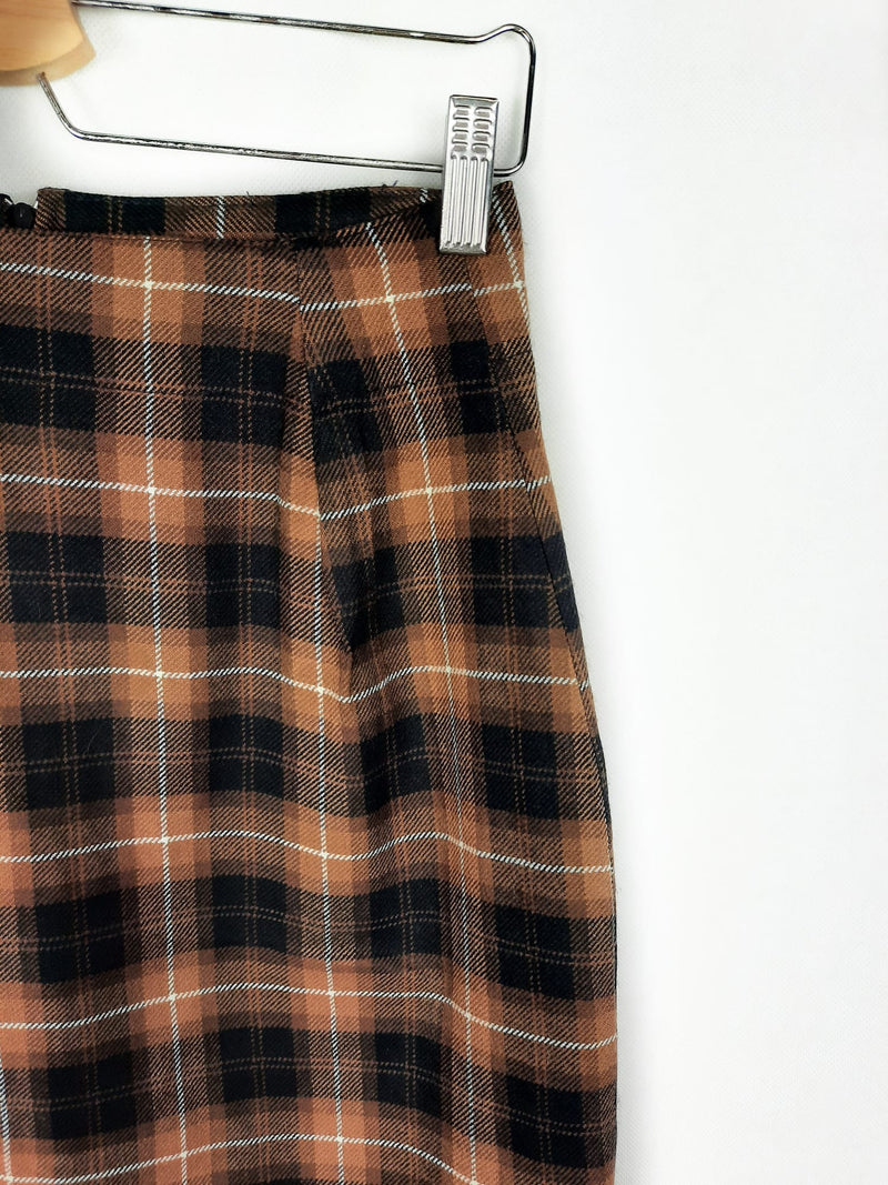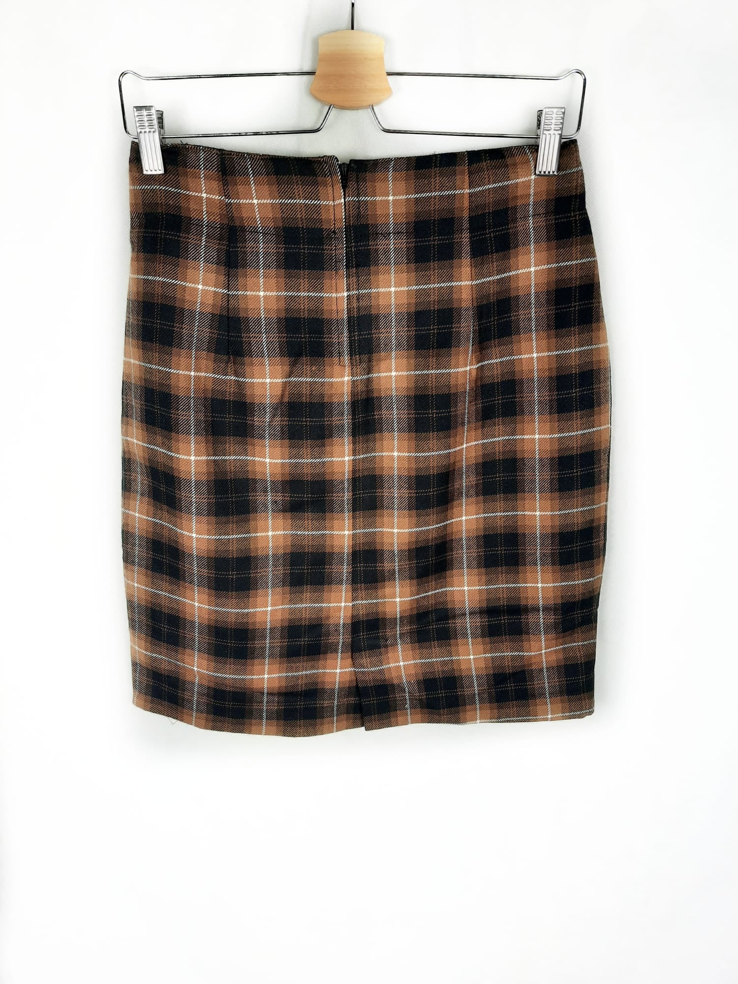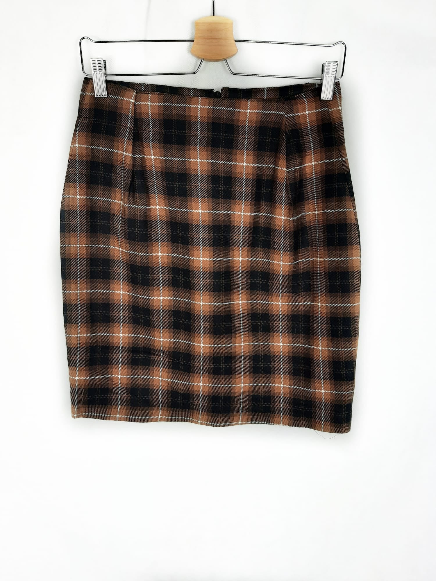 Falda de cuadros cortita en tono marrón y negros. No elástica. Cintura 36 cm largo 53 cm