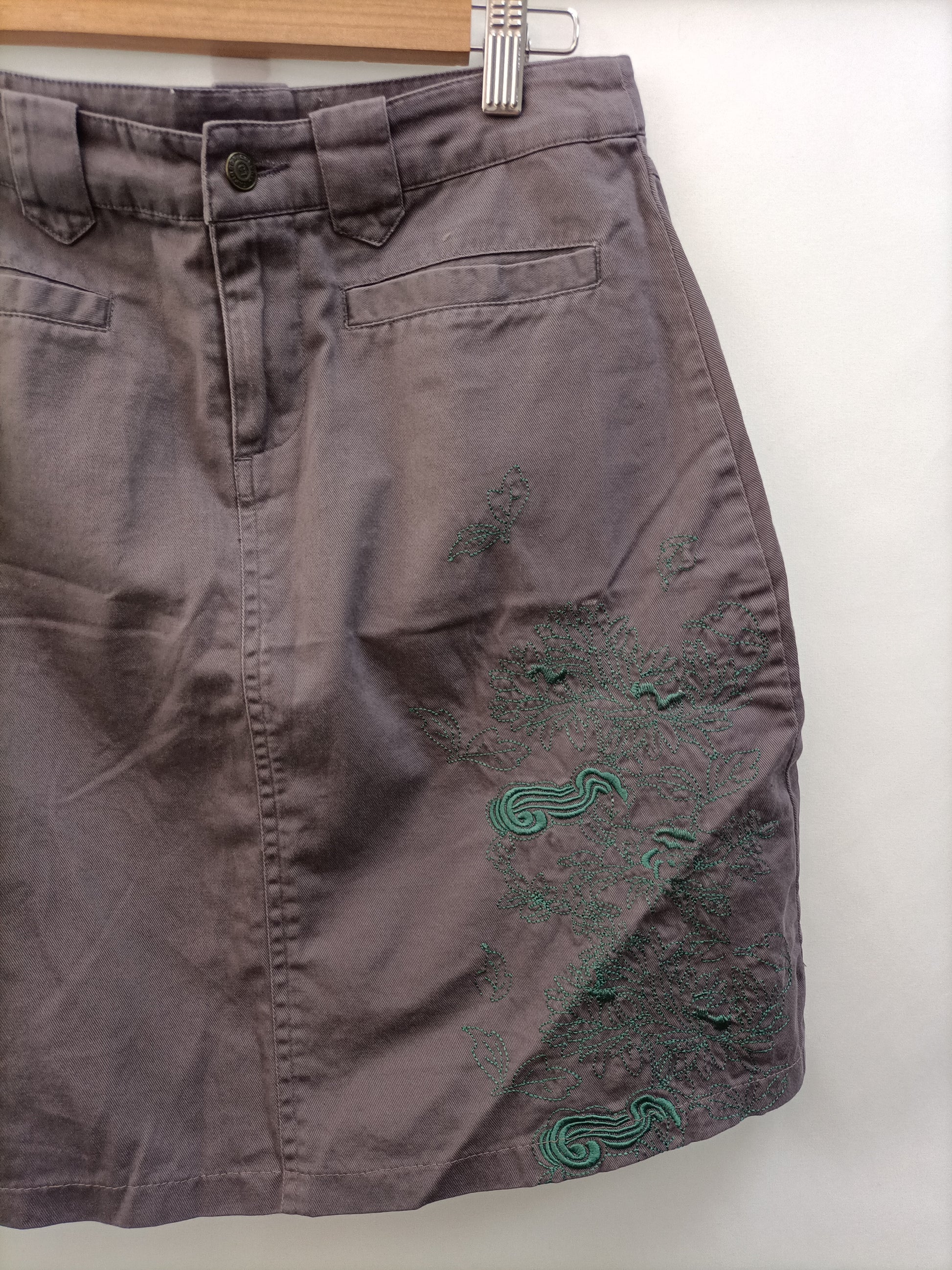 Falda grisácea vaquera finita con bordado verde. Cintura 36 cm largo 48 cm