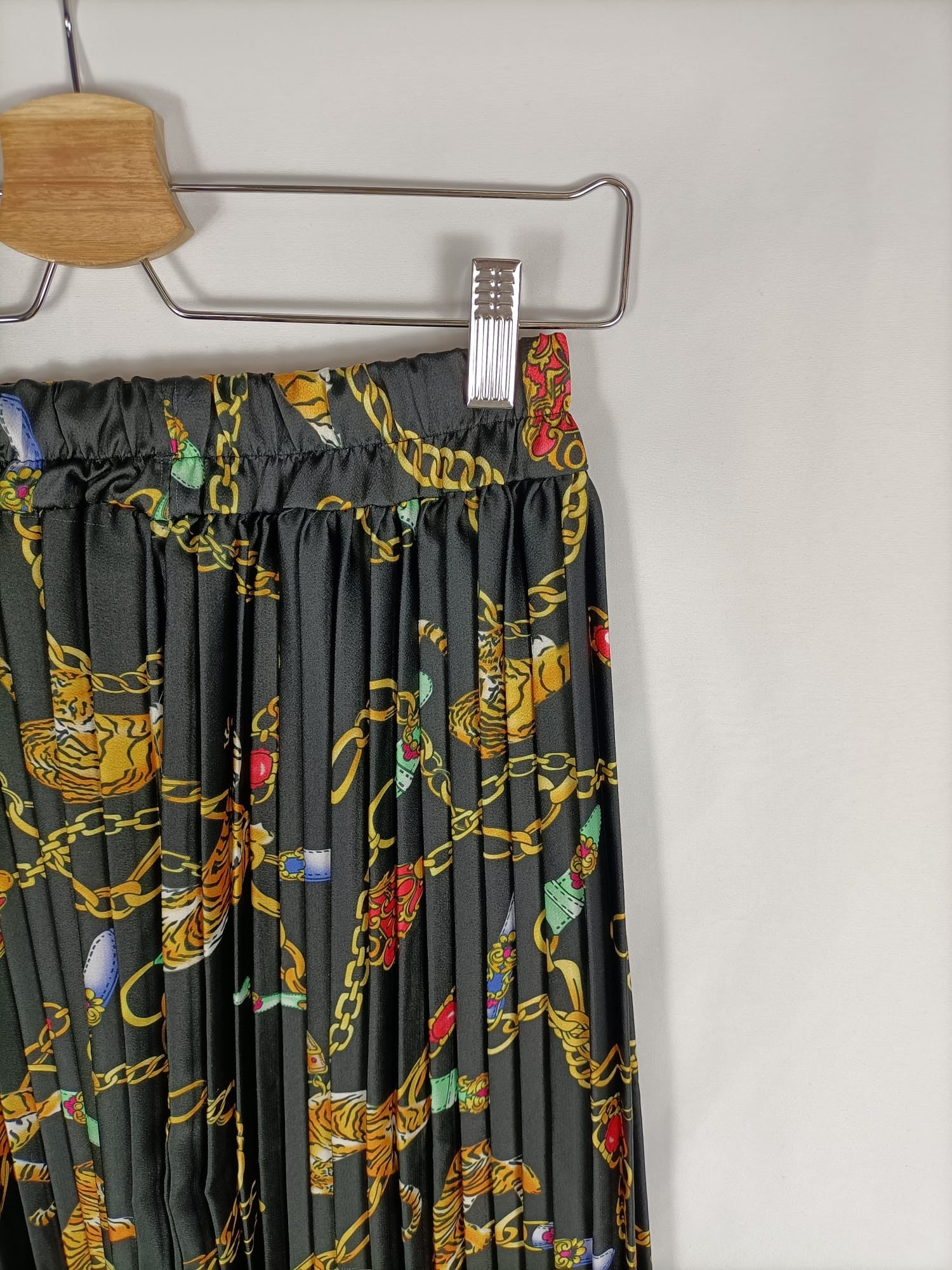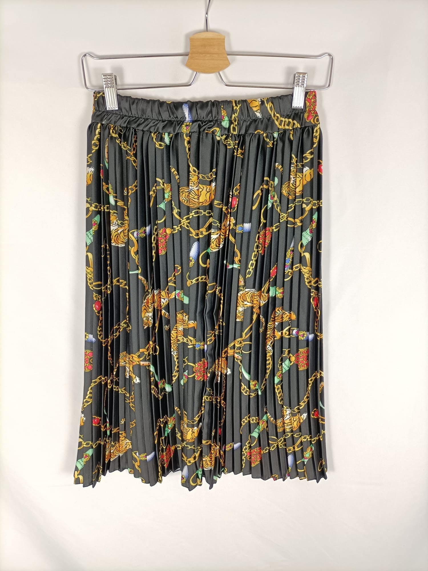 Otras.TU (S/M). Falda midi plisada negra con estampado de tigres y joyas. Cintura elástica. Largo 72 cm