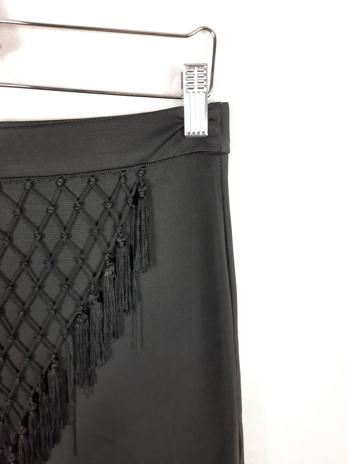 Otras. Falda negra de tejido tipo licra elastico con detalle de flecos. Largo (sin flecos) 38 cm