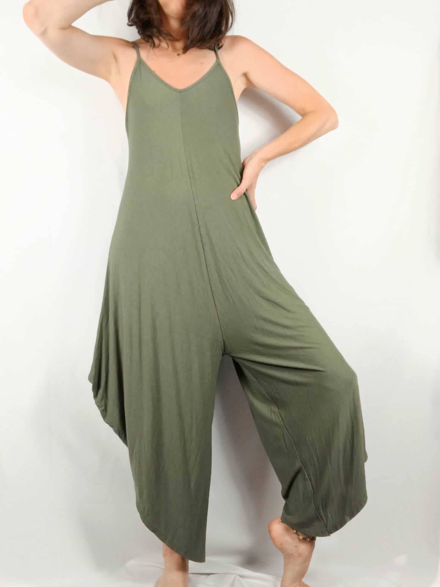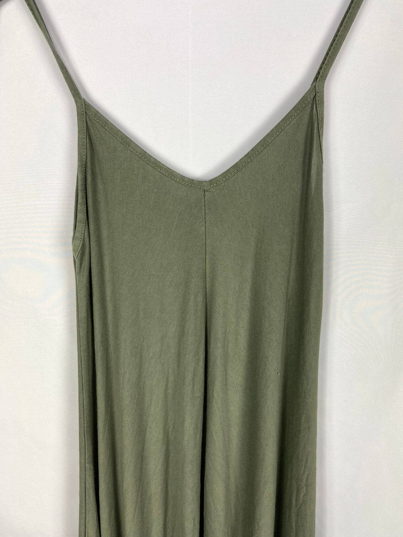 OTRAS TU. Mono bombacho verde caza. Largo irregular. Largo 132cm (zona más larga) elástico