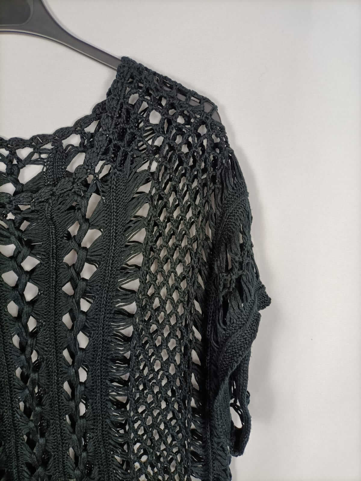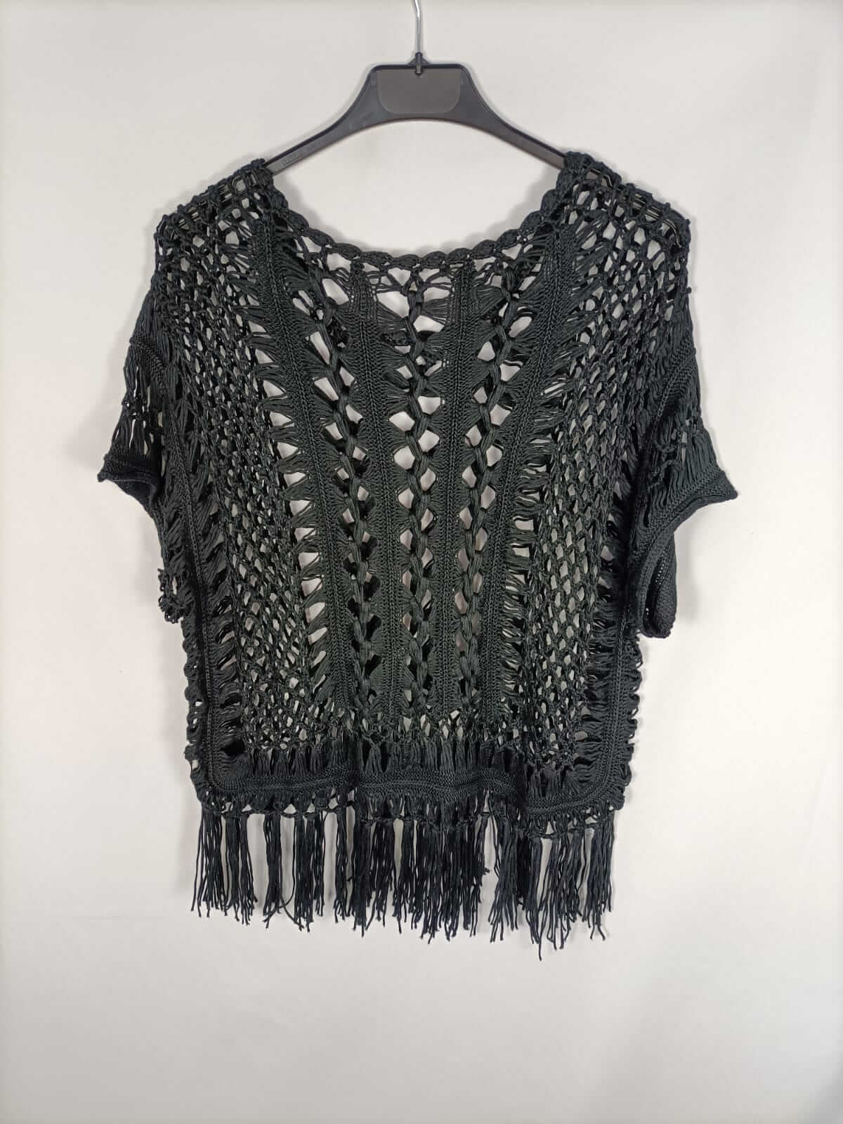 Otras. Tu. Top negro de punto troquelado con flecos. Elástico. Largo 74 cm