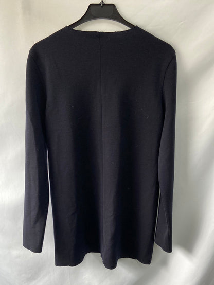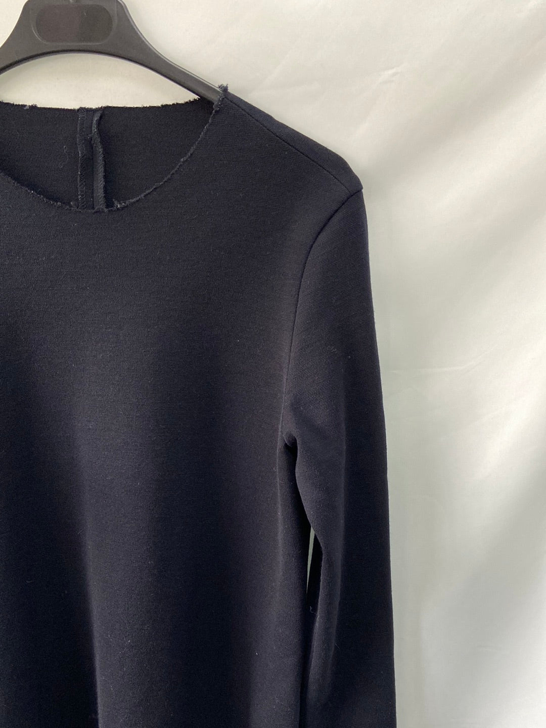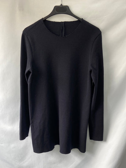 Vestido azul marino de tejido elástico. Cuello, mangas y parte de abajo sin costuras. Largo 77 cm ( era una s).