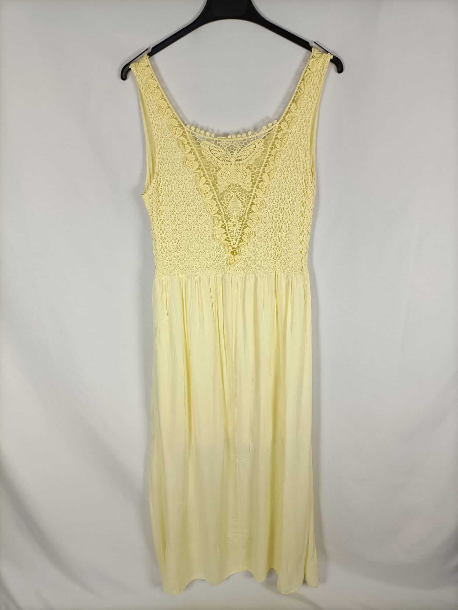 Otras. Tu. Vestido largo amarillo con detalle de encaje en el escote. Fluido y elástico. Largo 133 cm