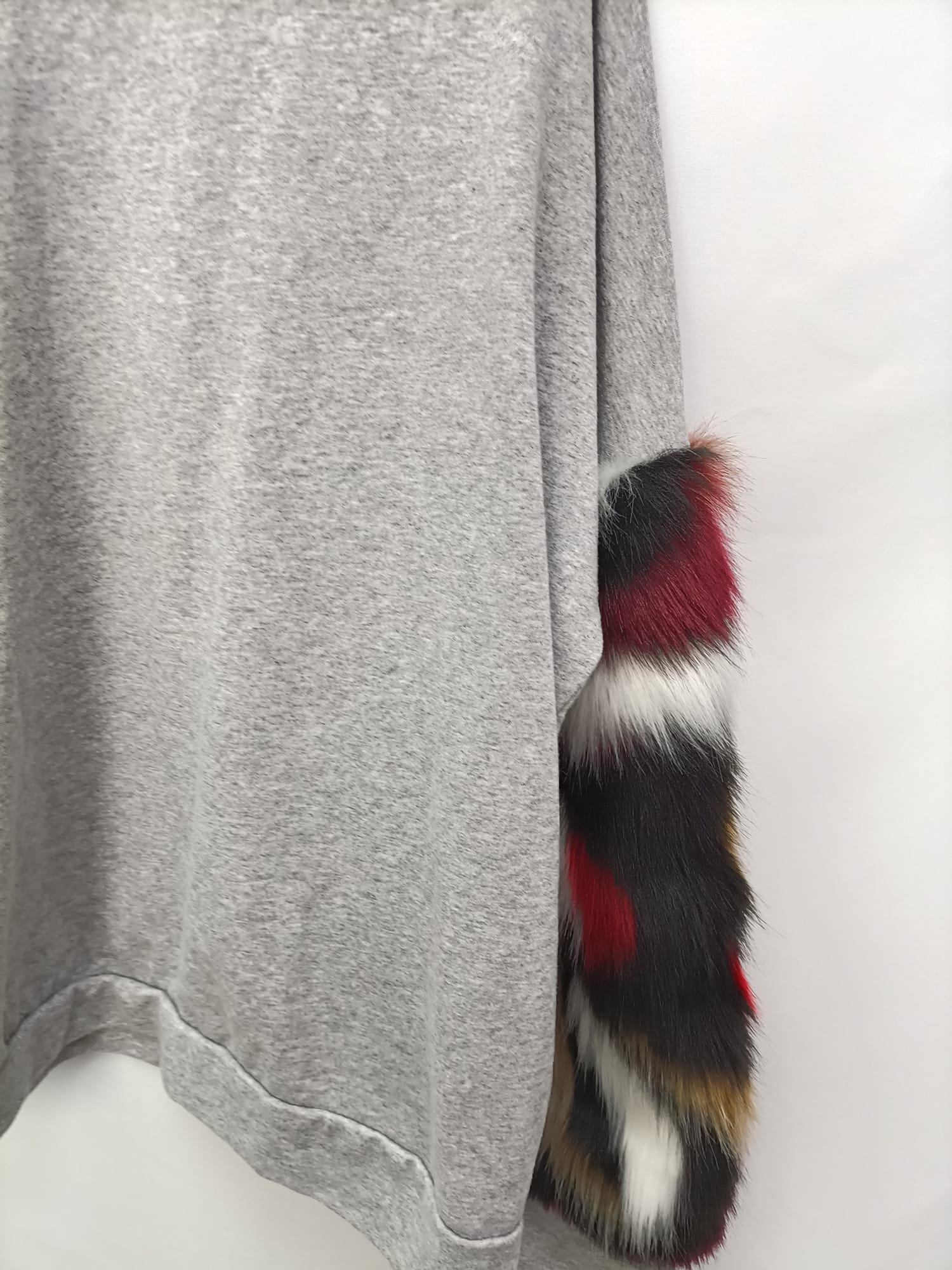 Otras. Tu (s). Sudadera gris jaspeada con detalle de pelo sintético en las mangas. Elastico. largo 58cm. Algodón y elastano