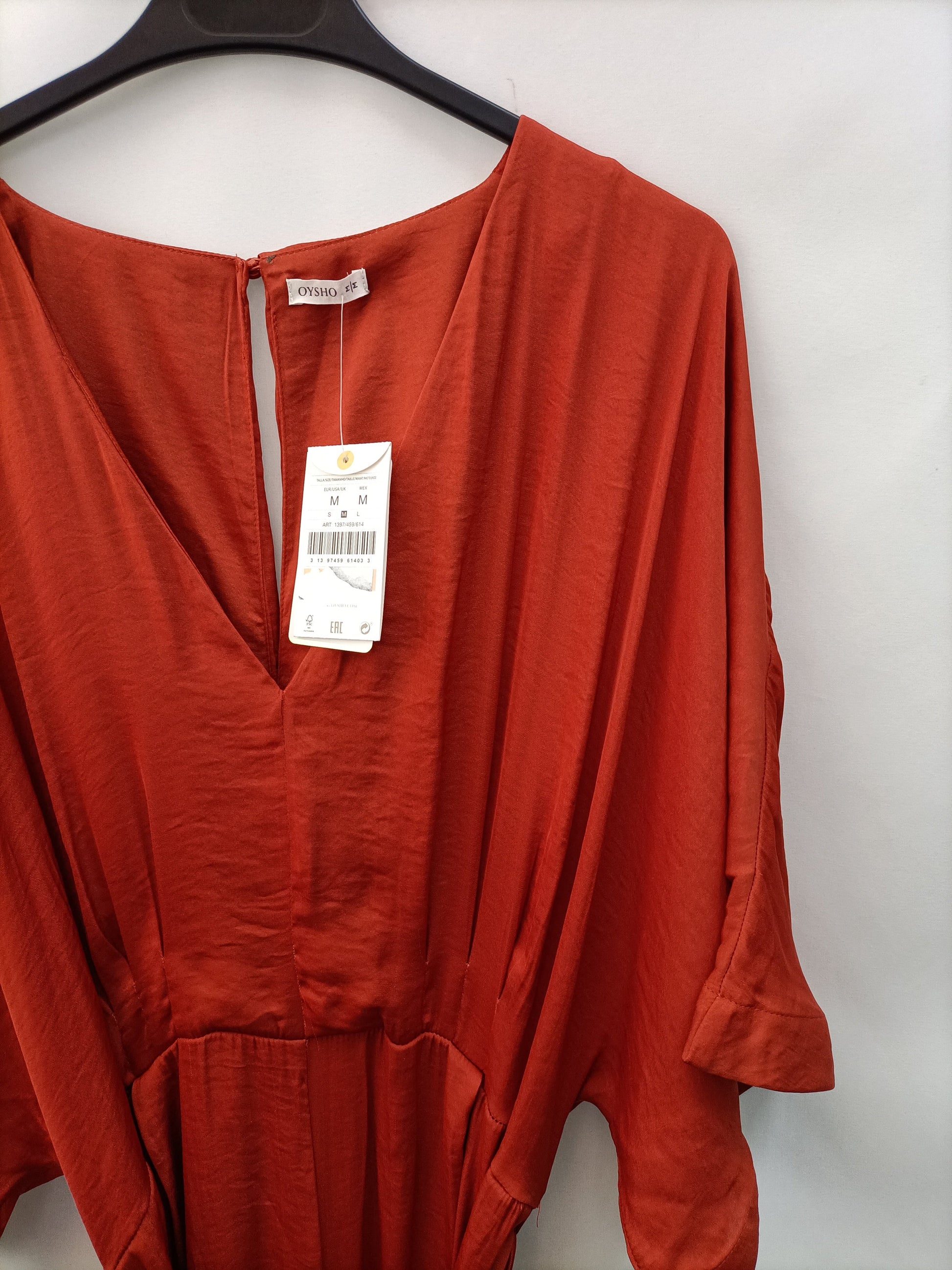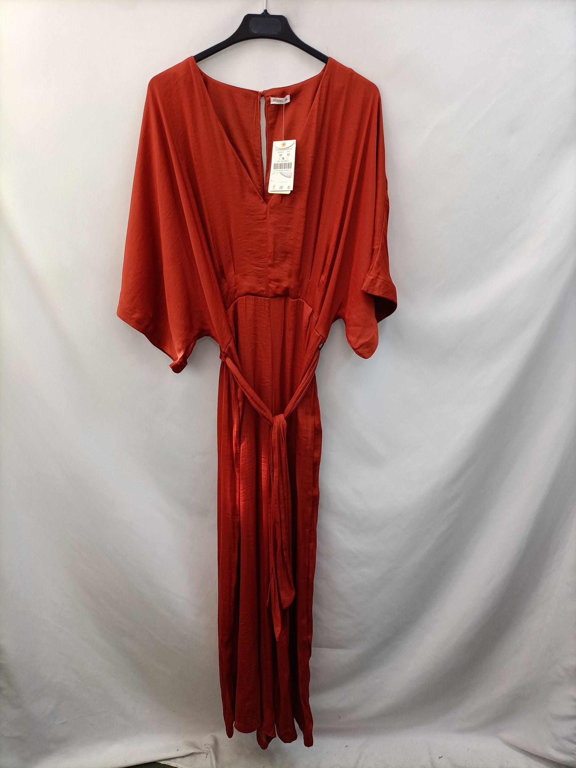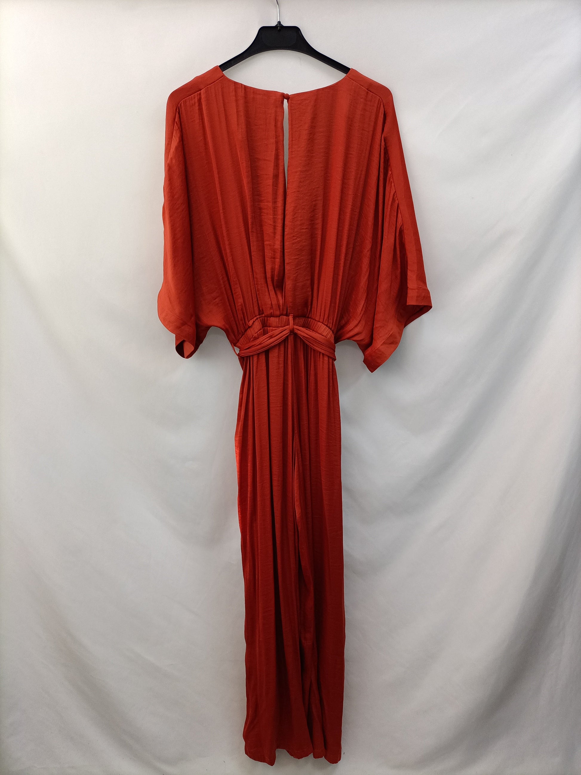 Mono fluido largo color teja mangas estilo murciélago. Cintura elástica con lazada. largo 145 cm
