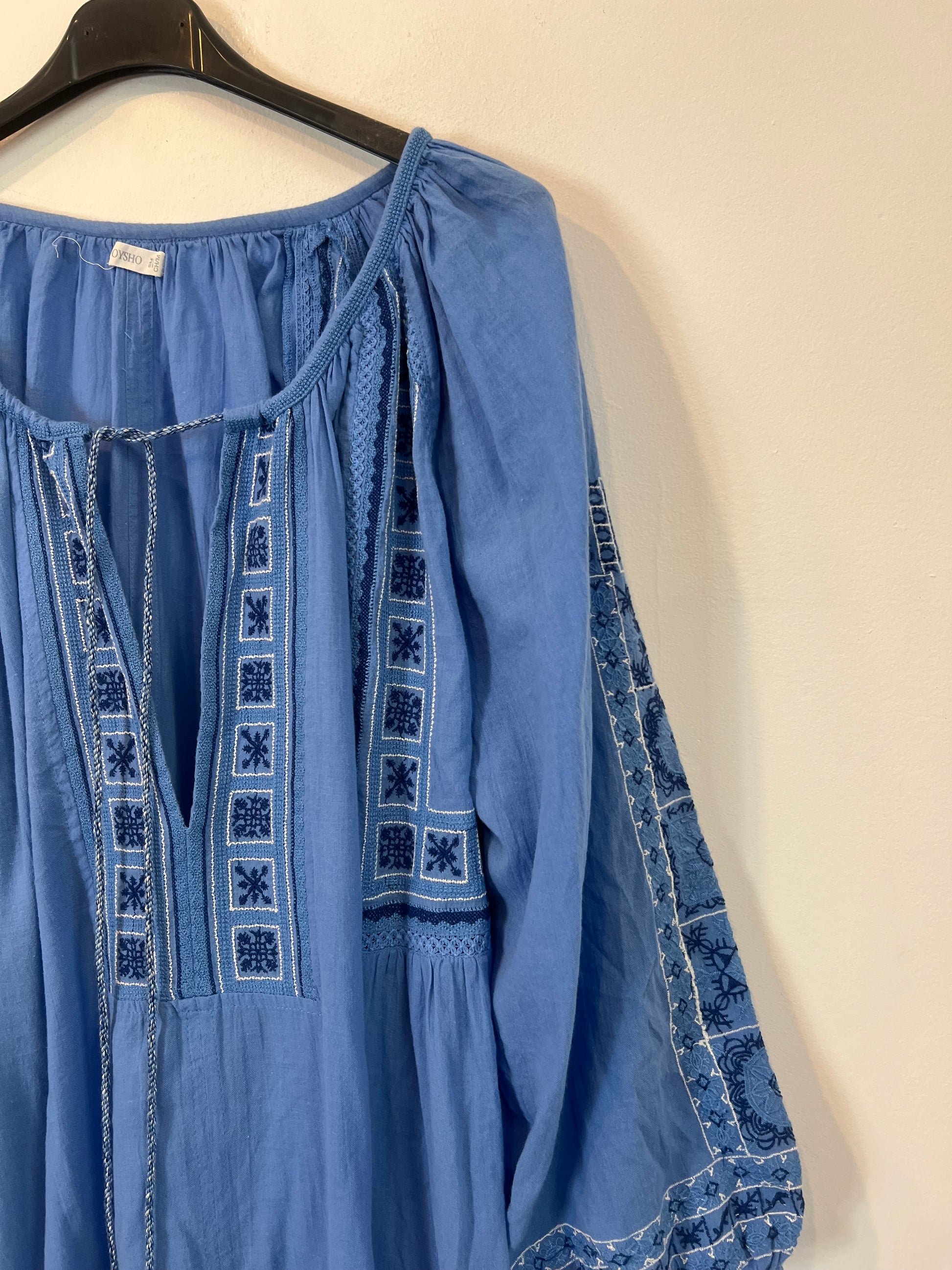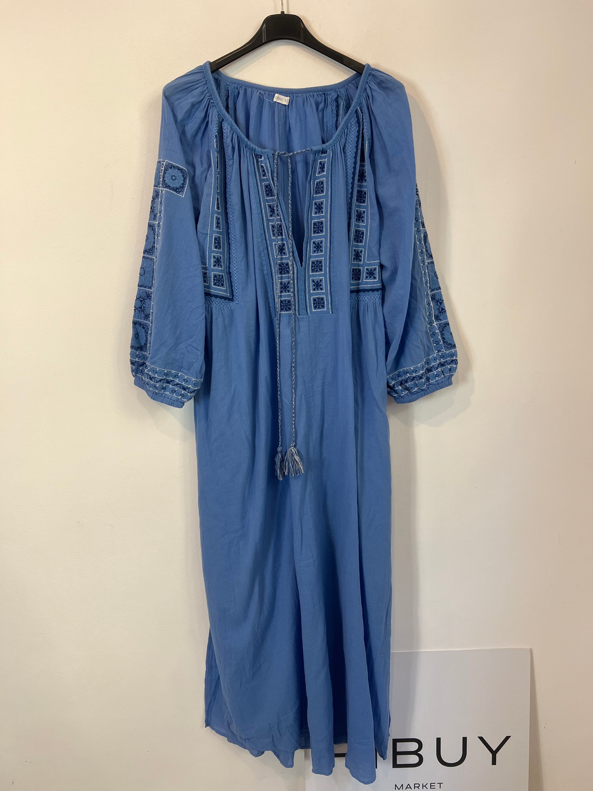 vestido largo azul bordado. de sisa a sisa amplia largos 135 cm