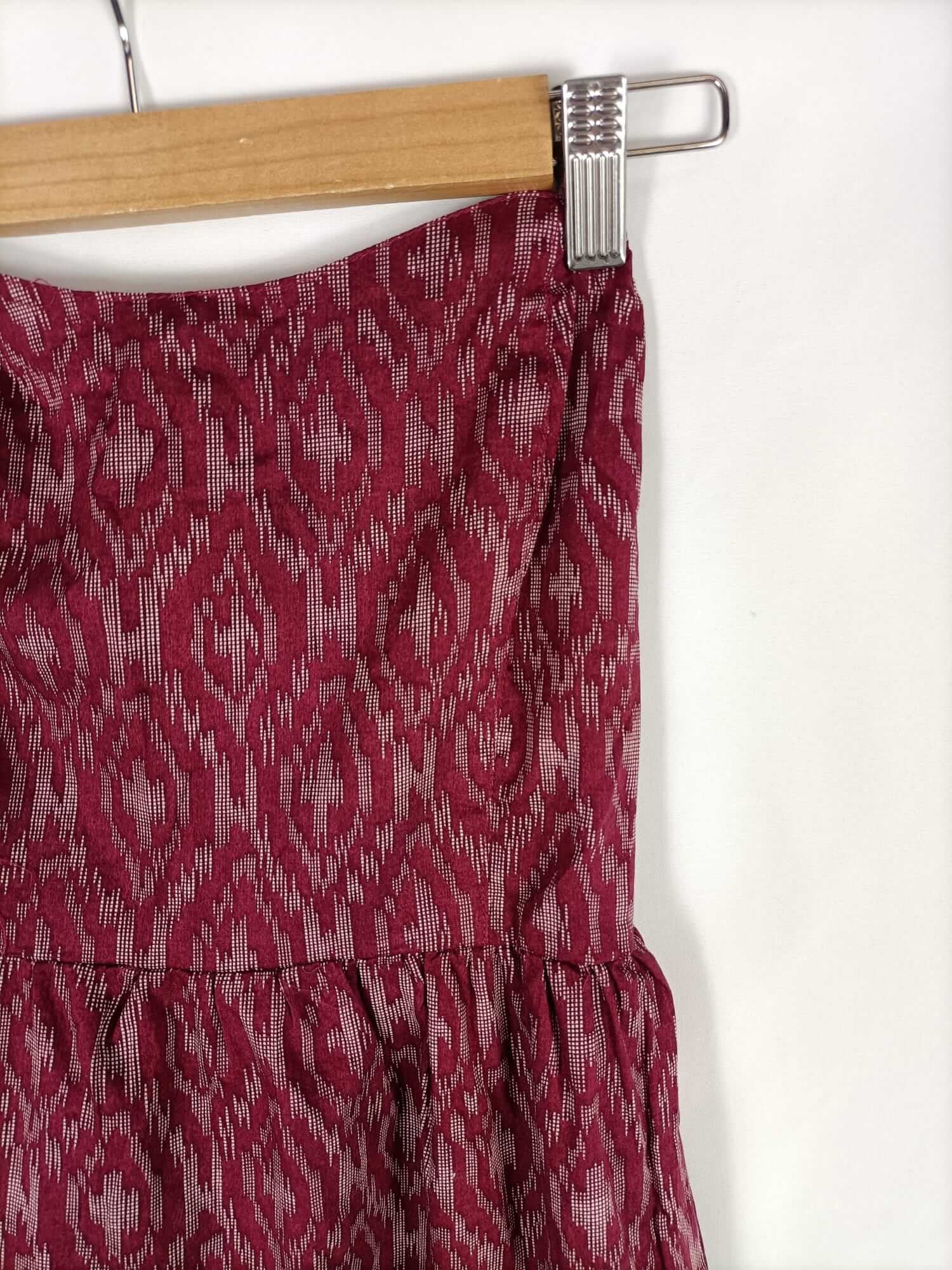 Oysho. M. NUEVO CON ETIQUETA. Vestido corto burdeos con estampado étnico. Palabra de honor con lazada en la espalda. Largo 74 cm.