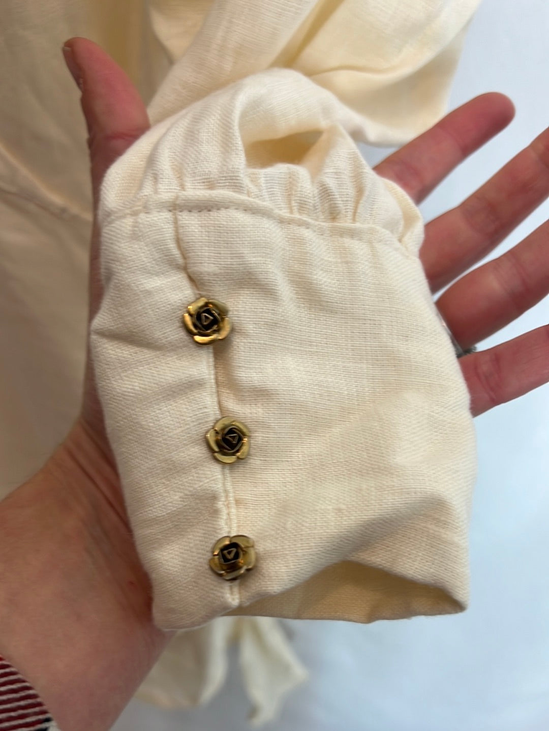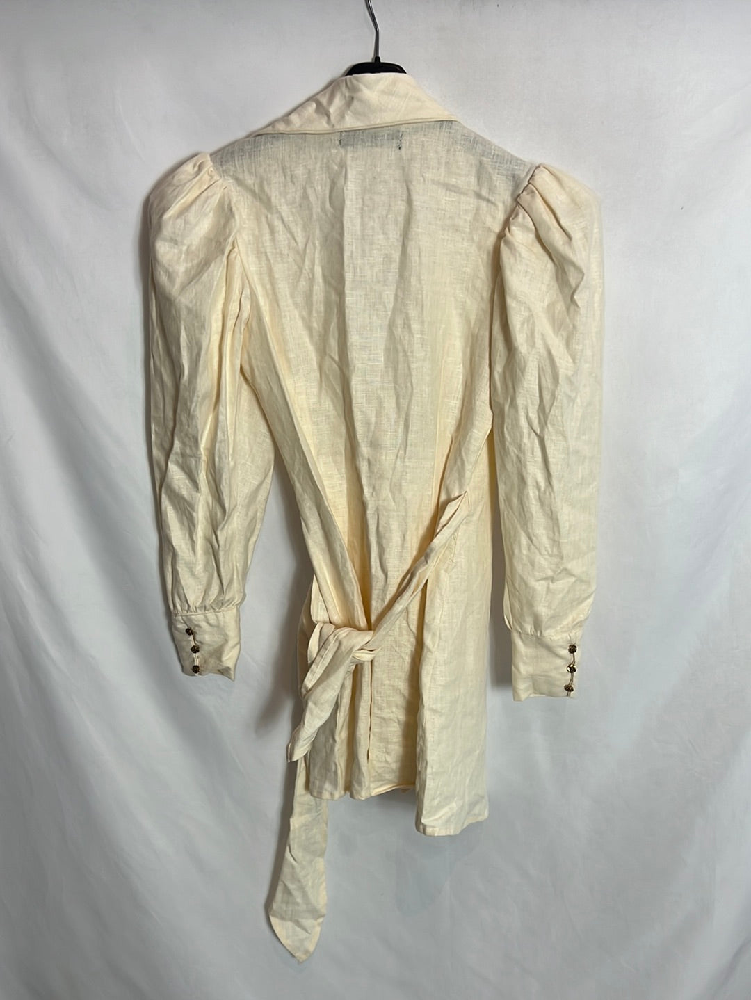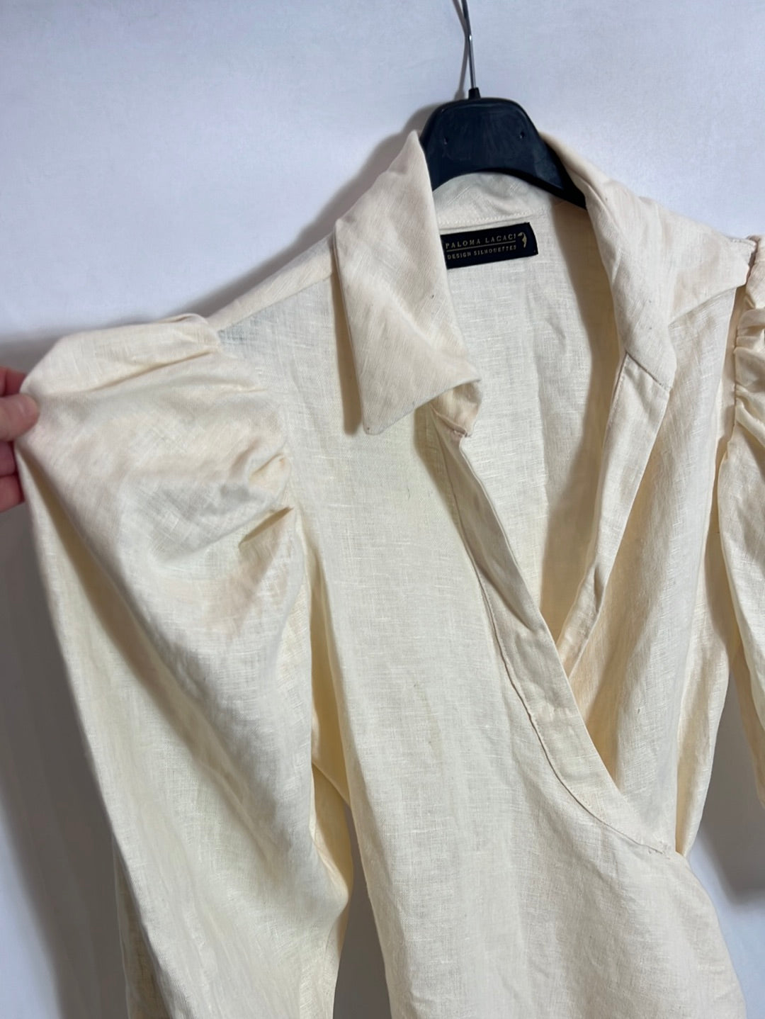 vestido corto beige cruzado con hombreras pronunciadas. De sisa a sisa 41cm, largo 80 cm