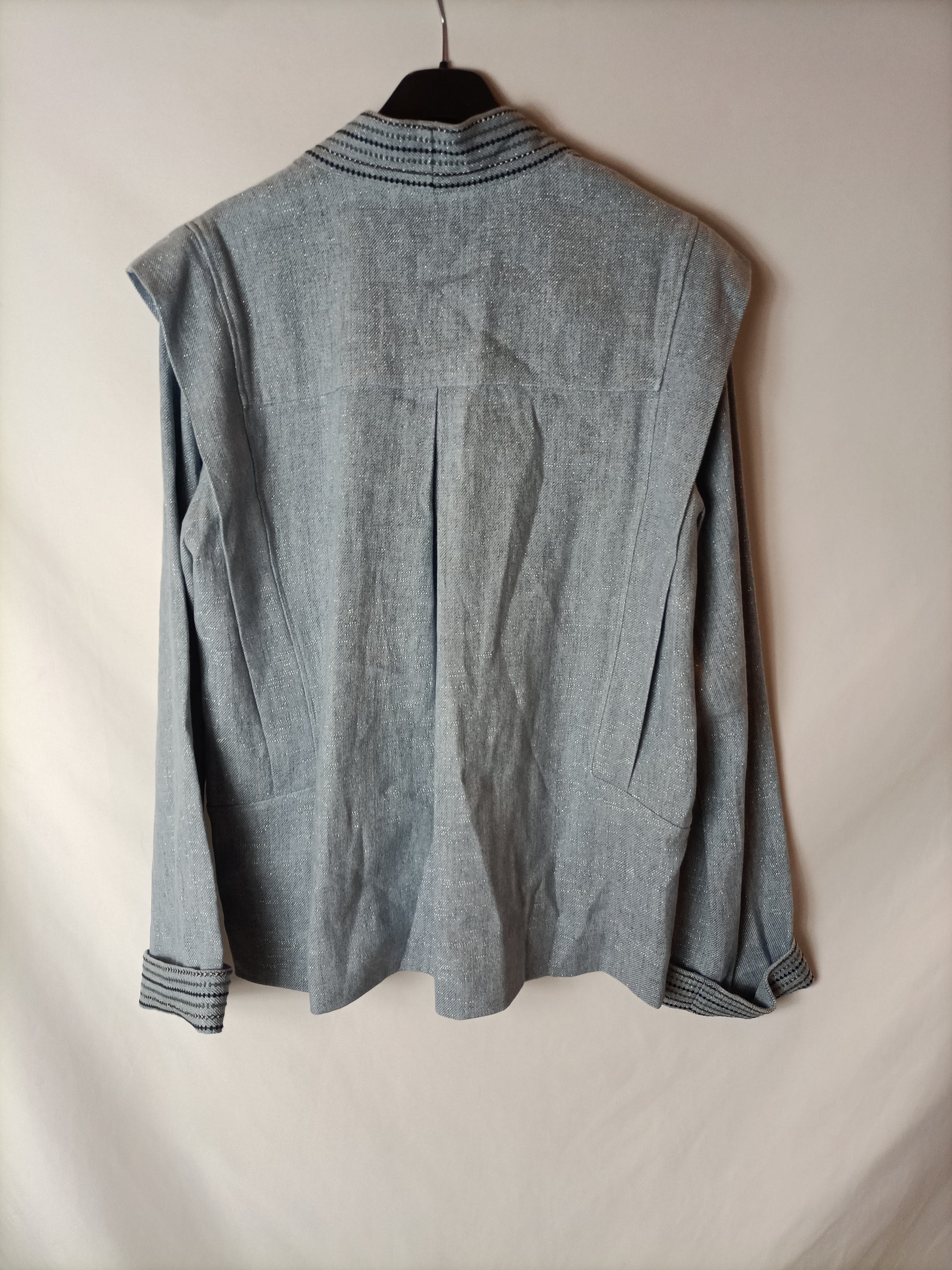 Total look de chaqueta y pantalón de pinzas azul con detalle de hilos metálicos.