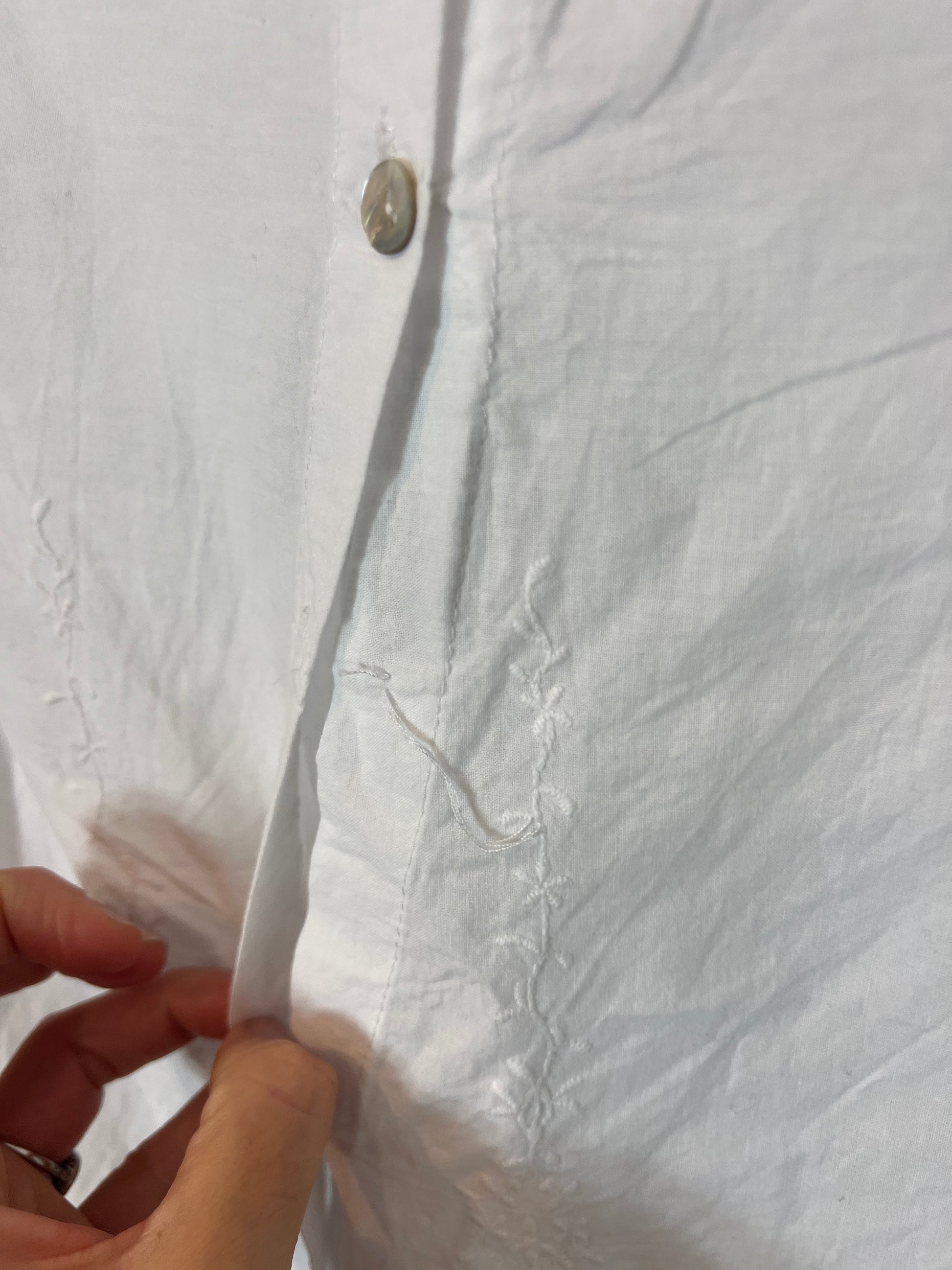 blusa blanca a botonada con detalles bordados . Tara: le falta un botón(foto). De sisa a sisa 44cm, largo 51cm