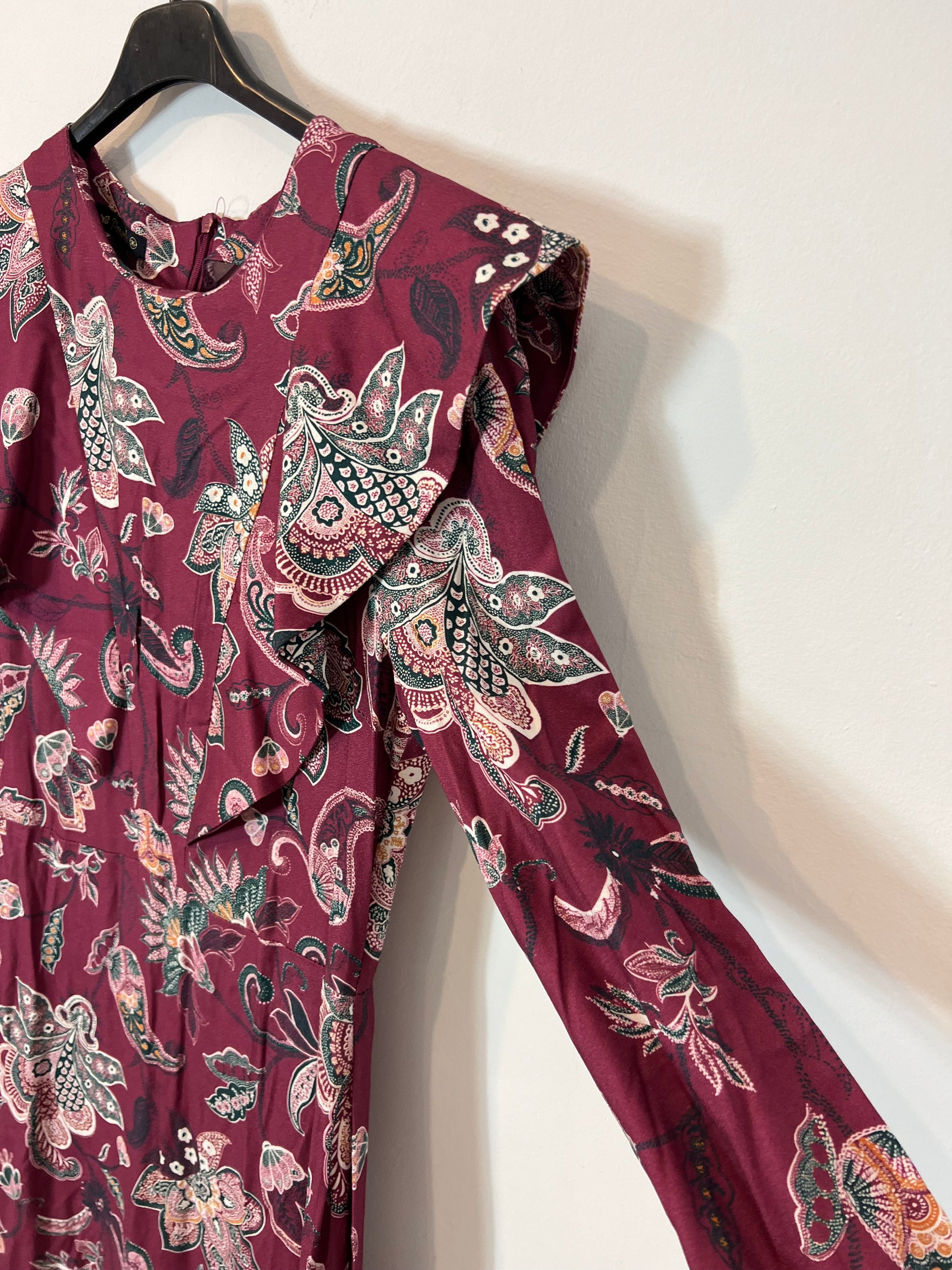 Vestido burdeos claro manga larga estampado amebas detalle volante. No elástico. Hombros 39cm, de sisa a sisa 45cm, largo 132cm