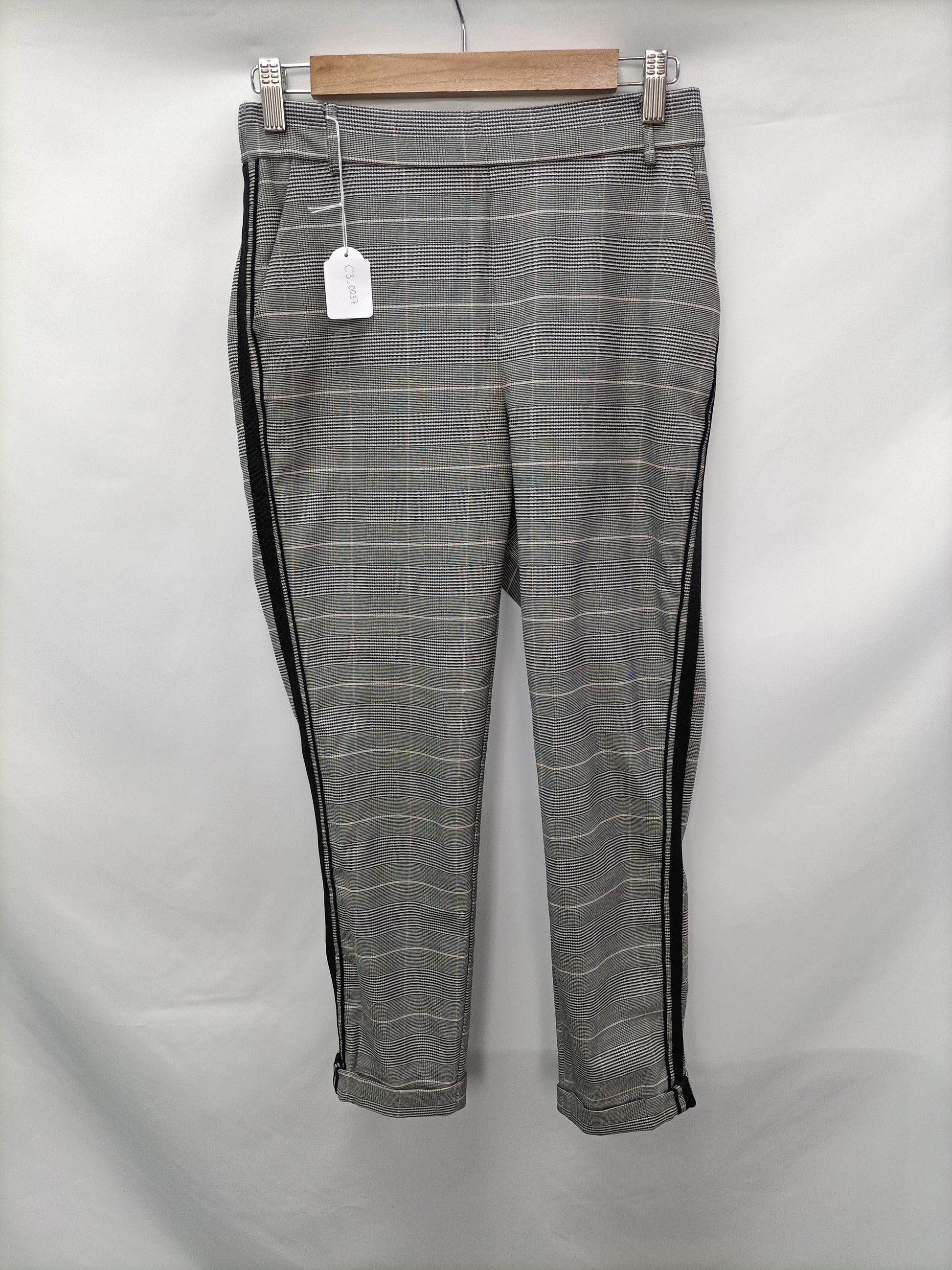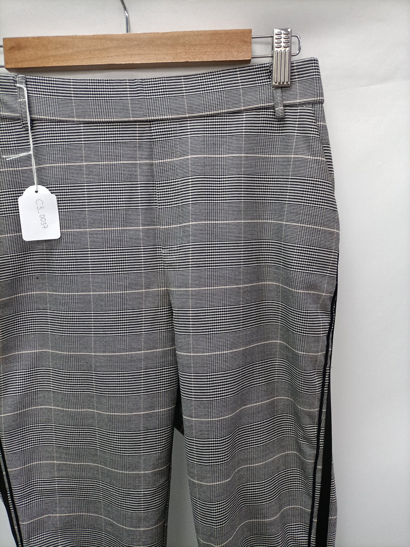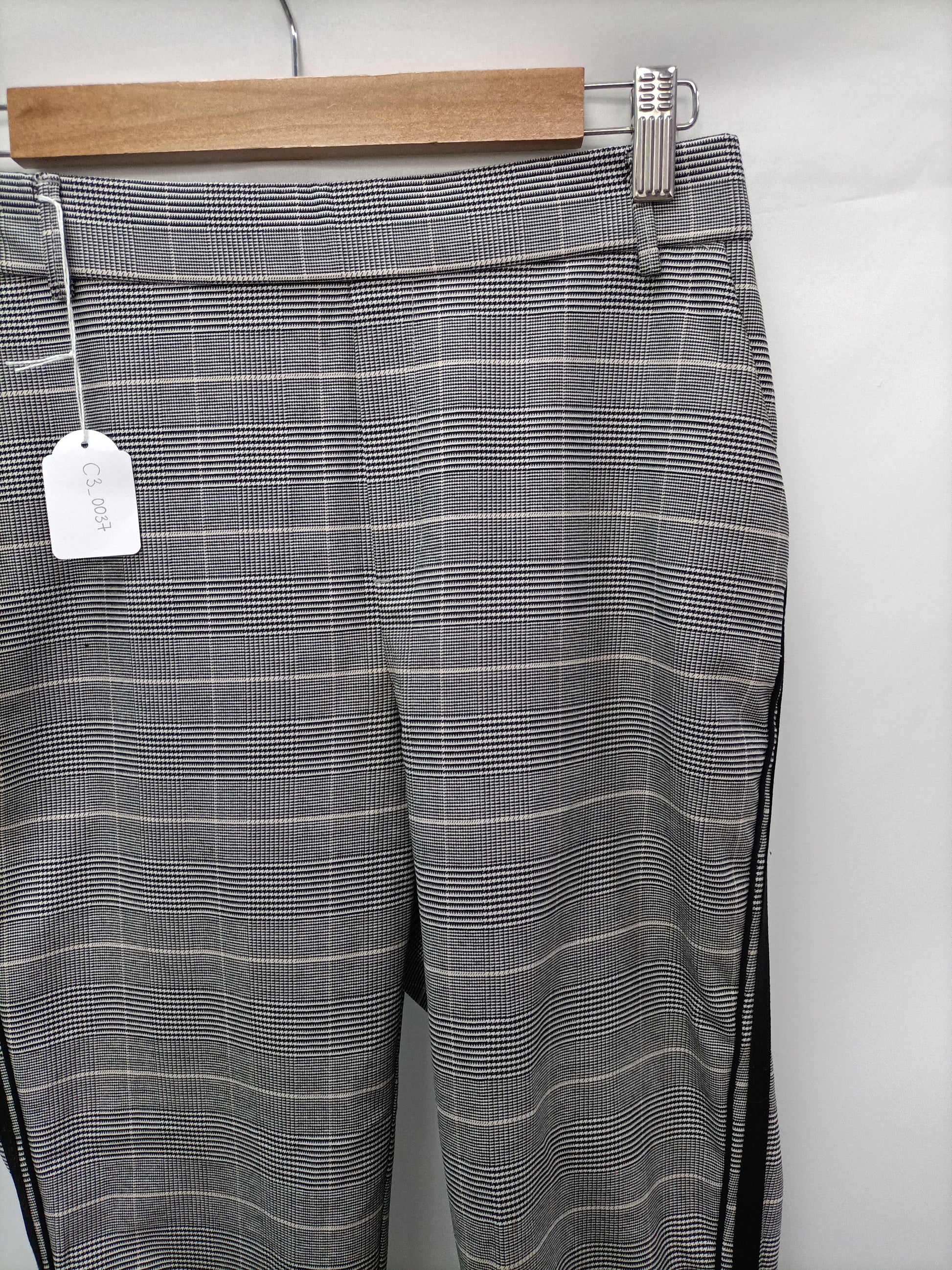 Pantalón recto de cuadros blancos y negros con raya lateral negra. Con goma en la cintura.