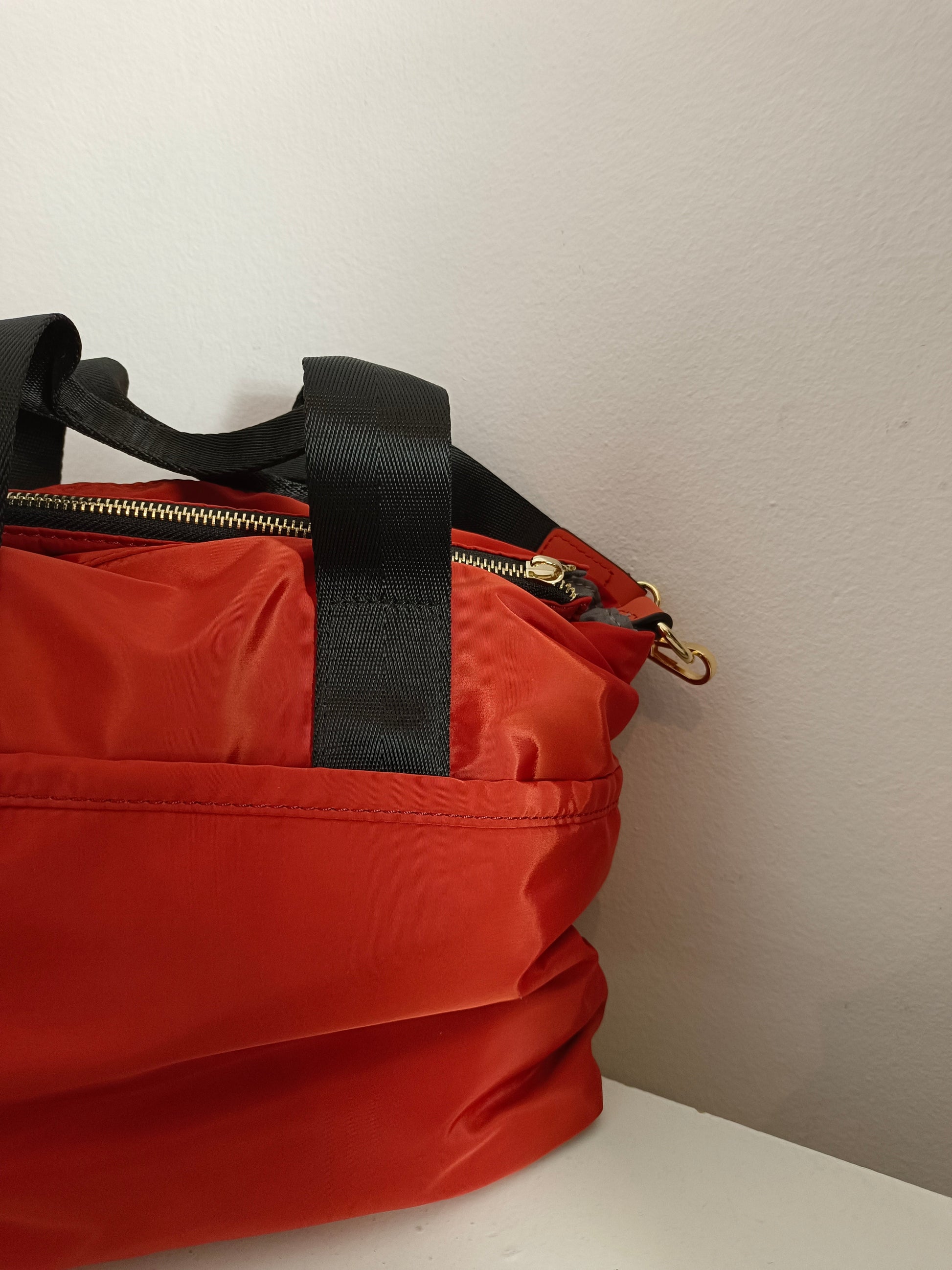 bolso media naranjas de lona con detalles en negro Tara: le falta el enganche de la cremallera