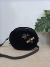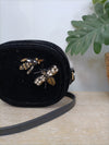 Bolso tipo bandolera negro de terciopelo con una libélulas de pedrería. Asa 63 cm, largo 20 cm, alto 16 cm, ancho 7 cm