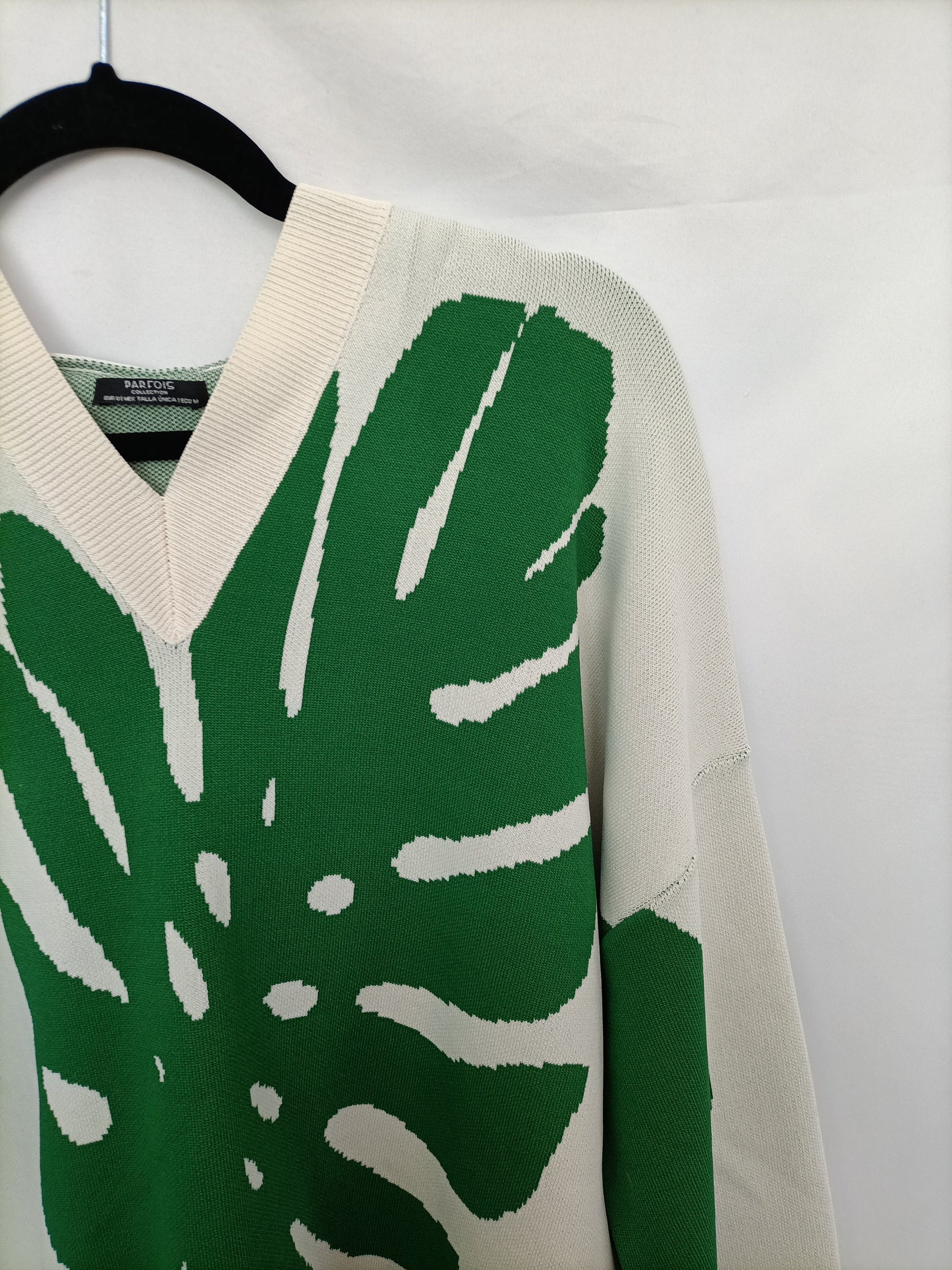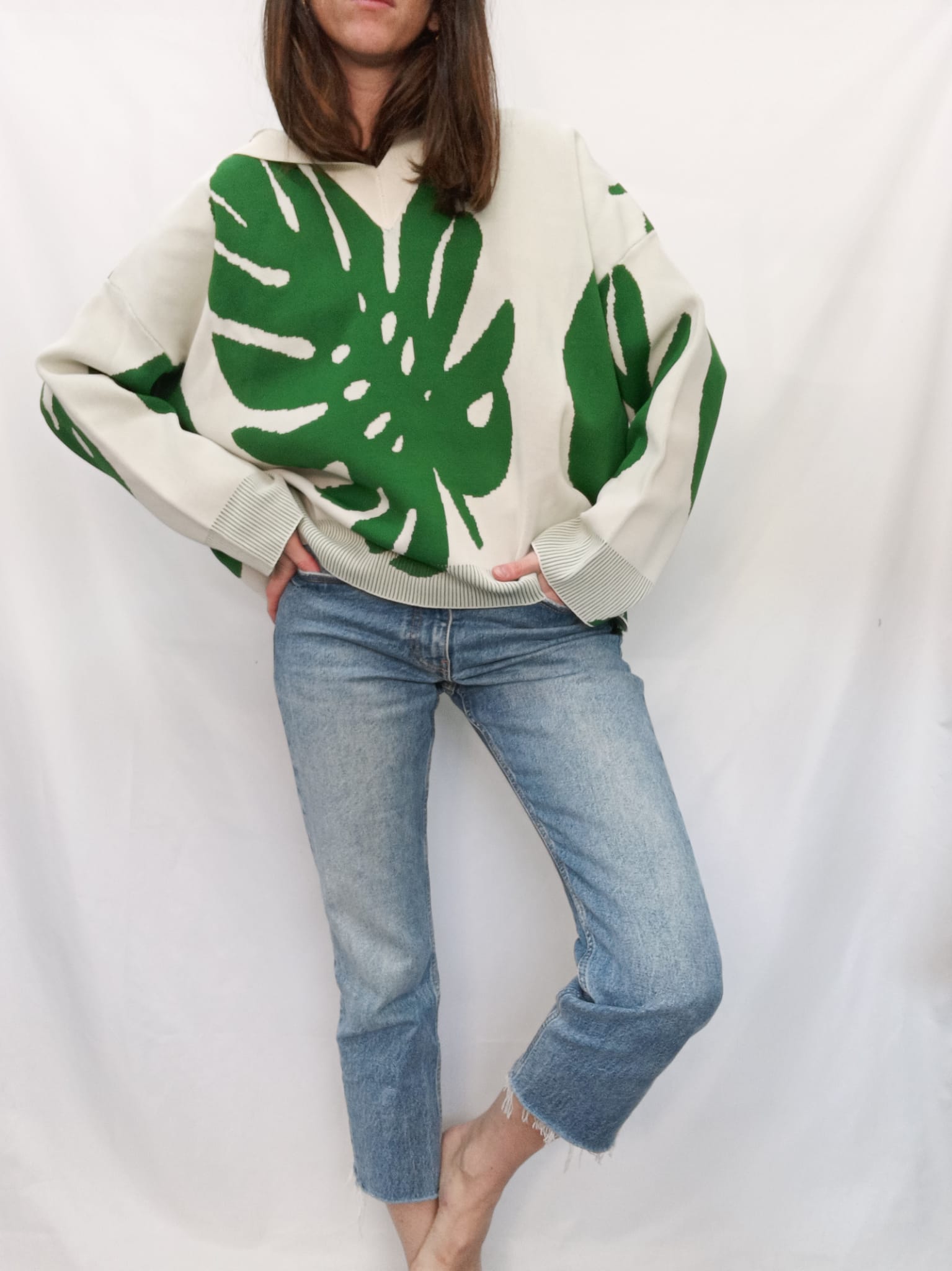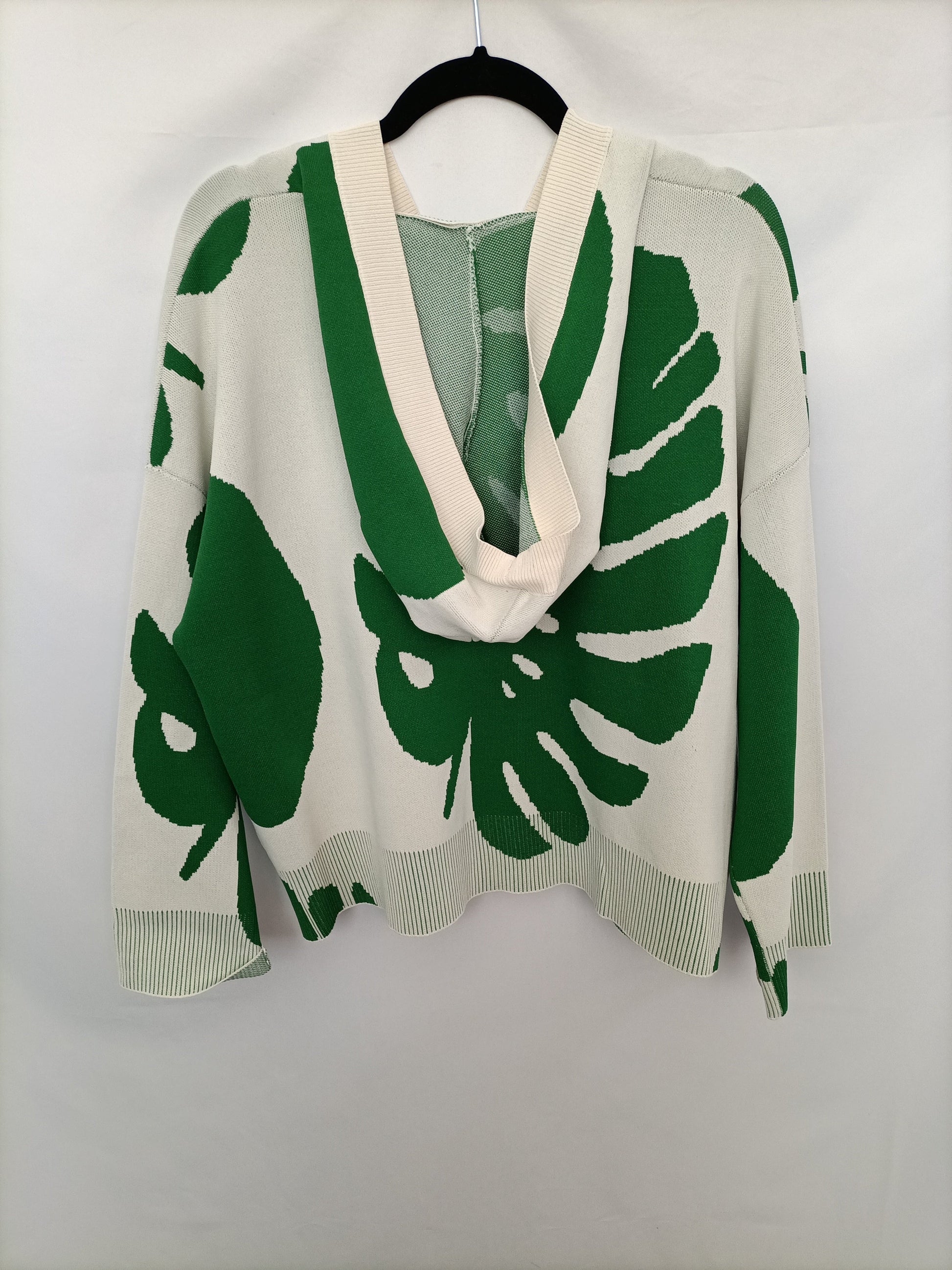 Jersey beige con capucha y estampado de hojas verdes. Largo 62 cm