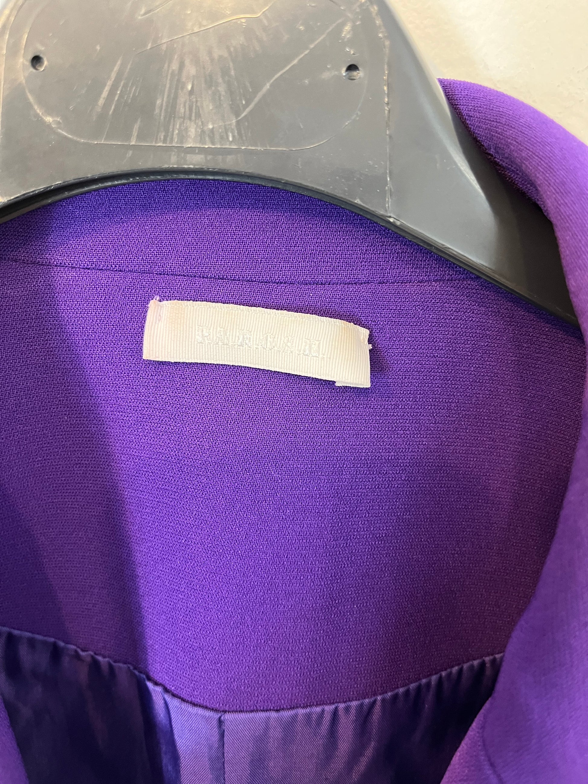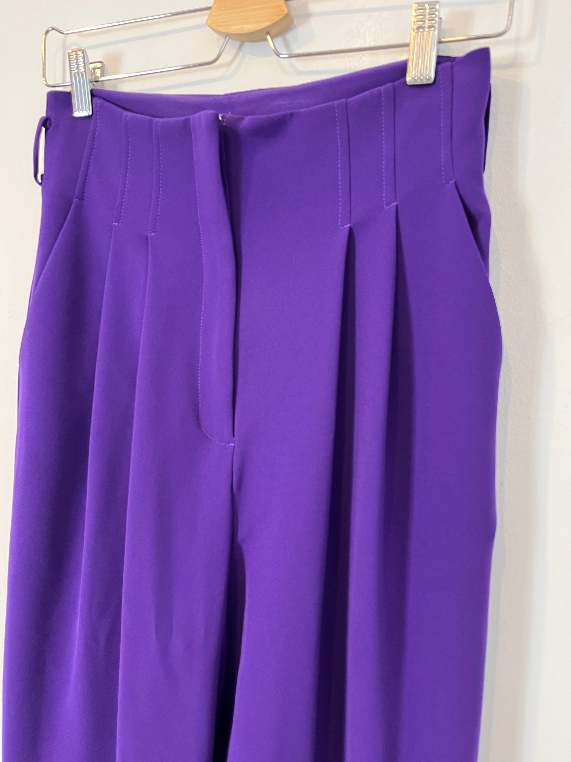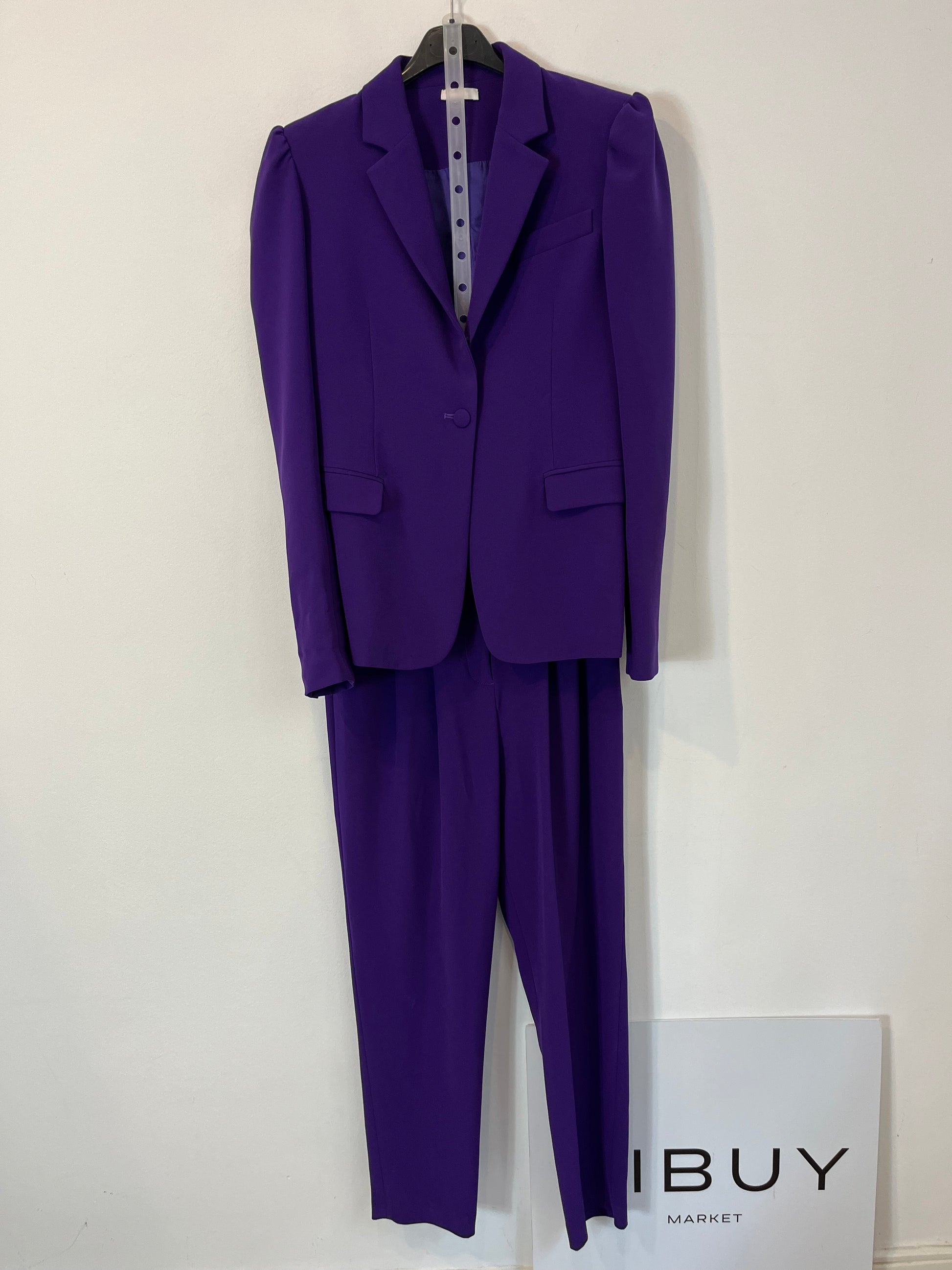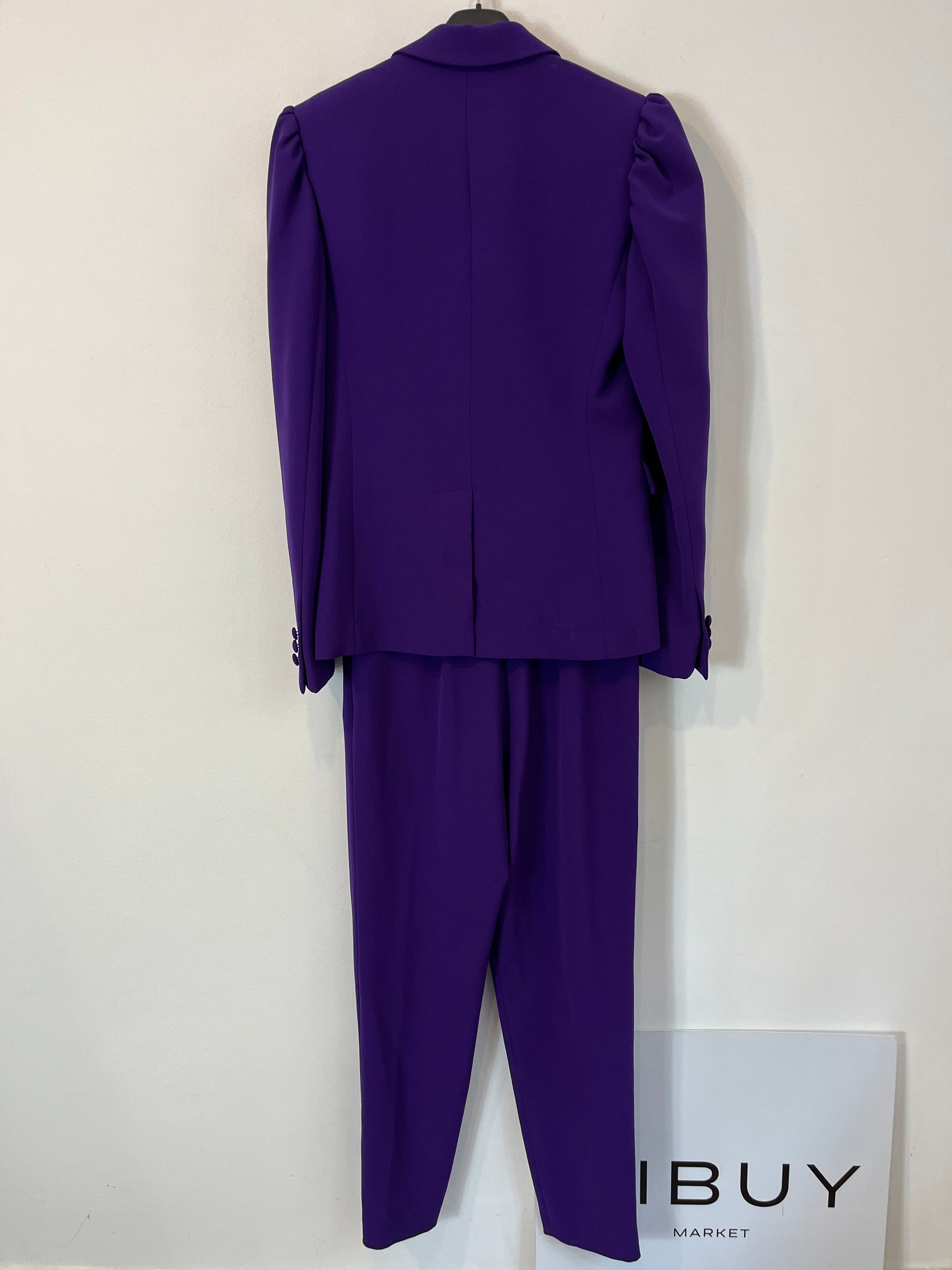 Traje de chaqueta morado de blazer y pantalón de pinzas.