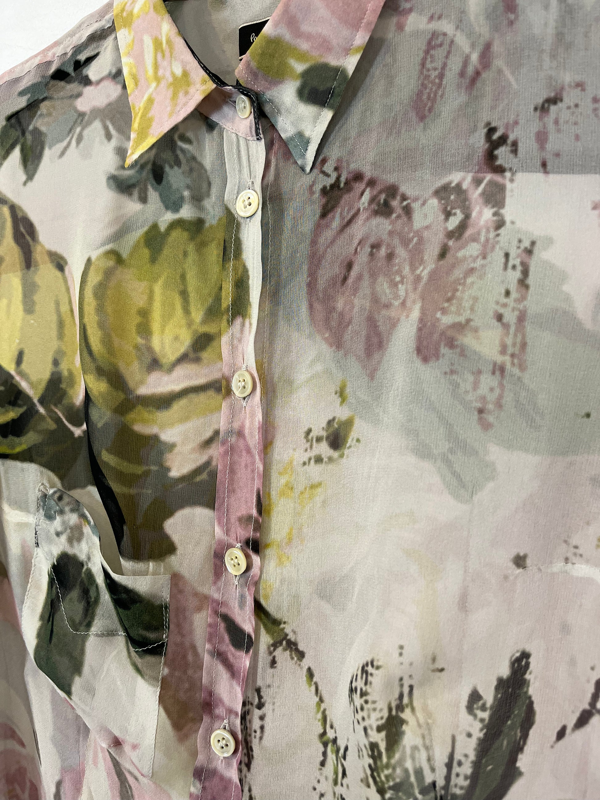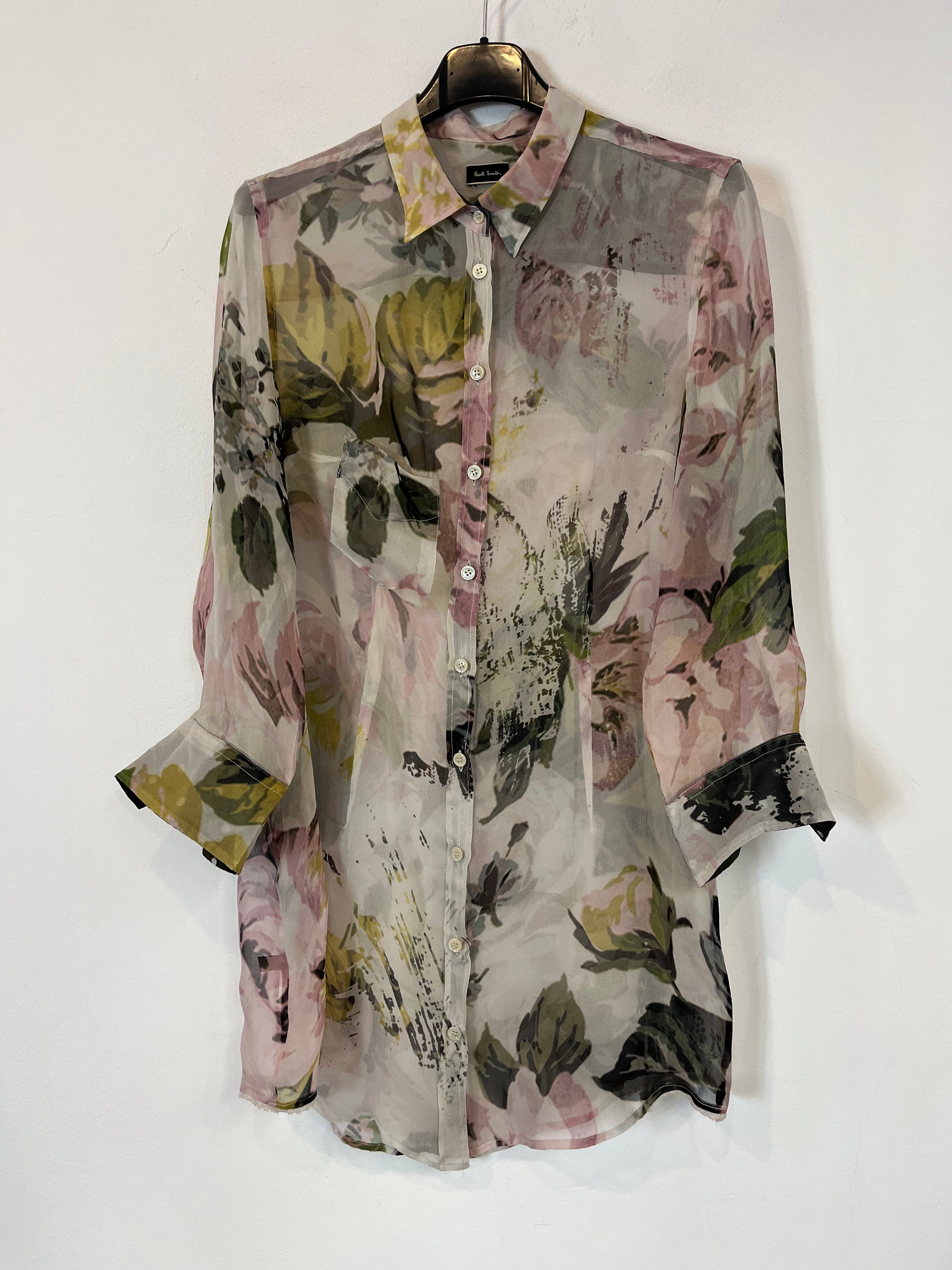 Parece seda pero tiene la etiqueta cortada. Talla 44 en etiqueta. Hombros 38 cm, Espalda 41 cm, largo 80 cm.