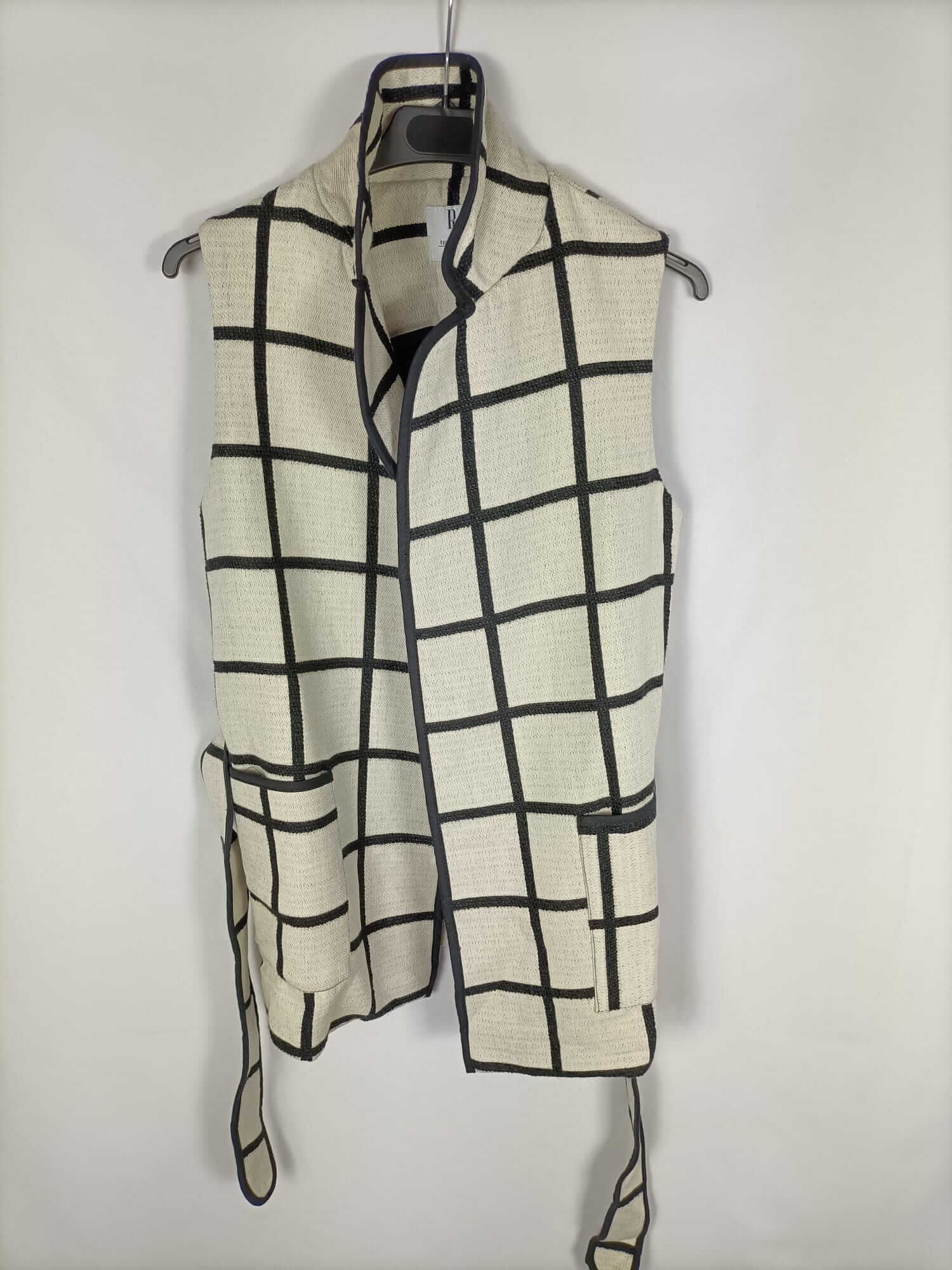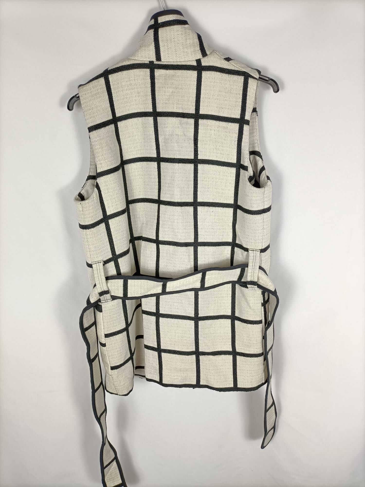 Paula junyet.s. haleco beige con cuadros negro. Tejido tipo algodón, se abrocha con lazada y no es elástico. De sisa a sisa 50 cm largo 78 cm