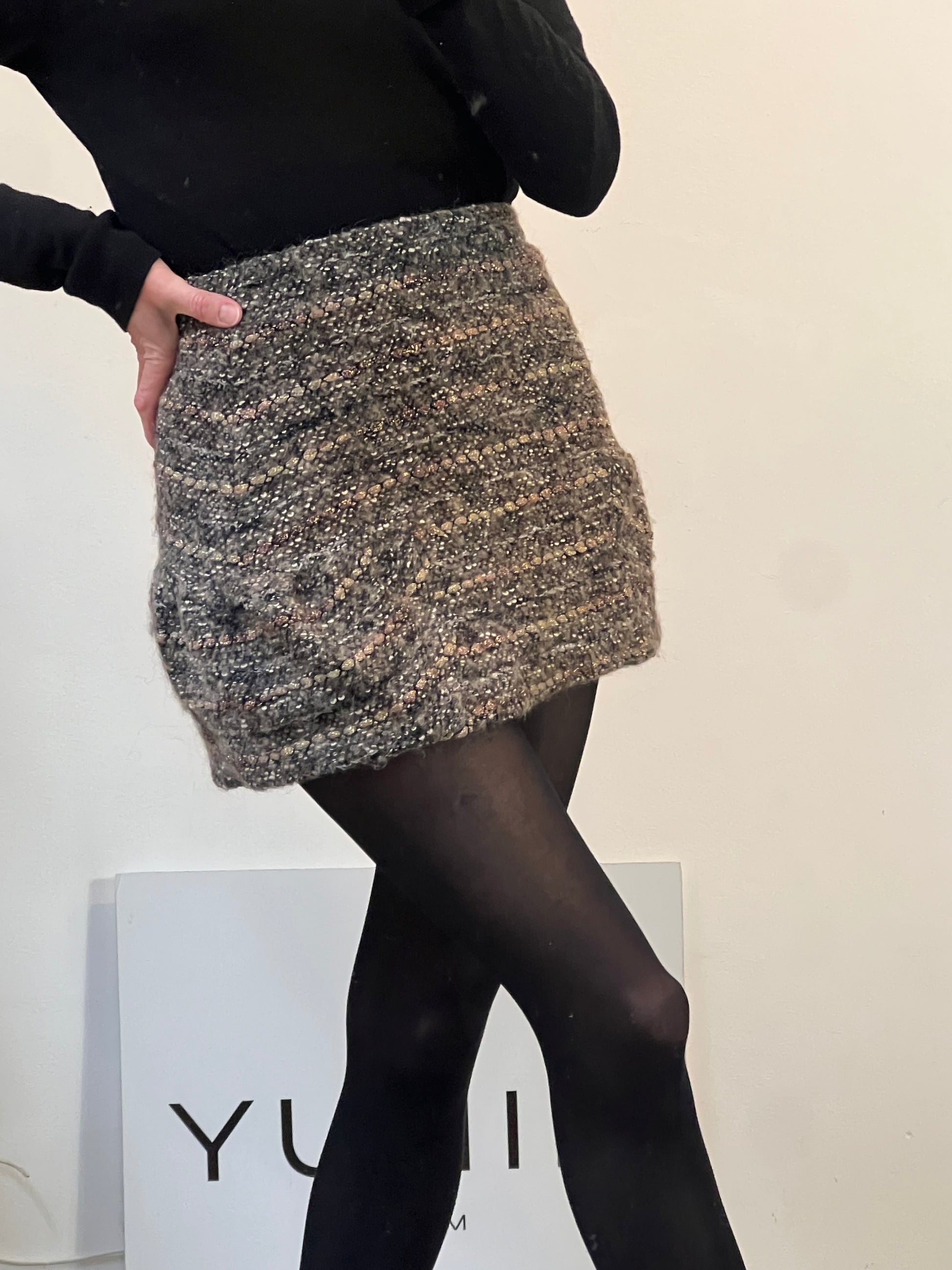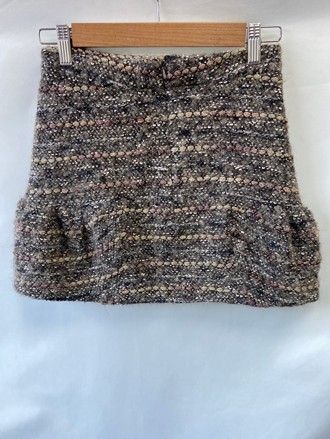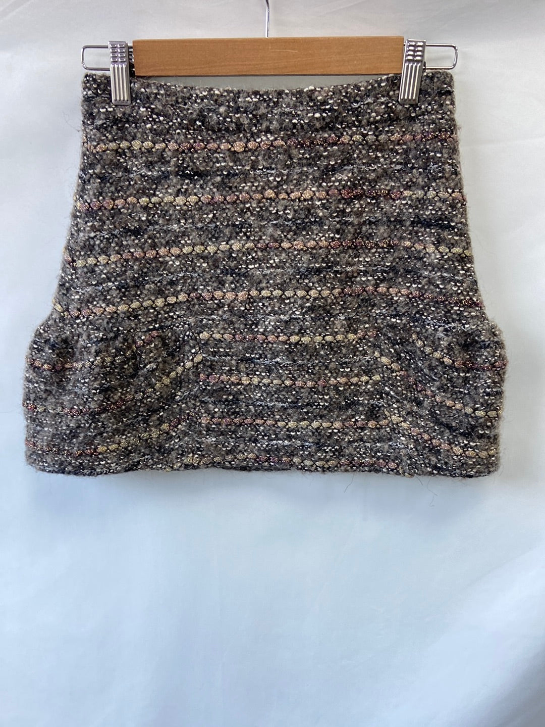 Falda corta fieltro. Líneas detalles brillantes. Tonos tierra. No elástica con cremallera trasera. Cintura 34 cm largo 36 cm