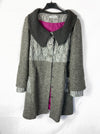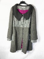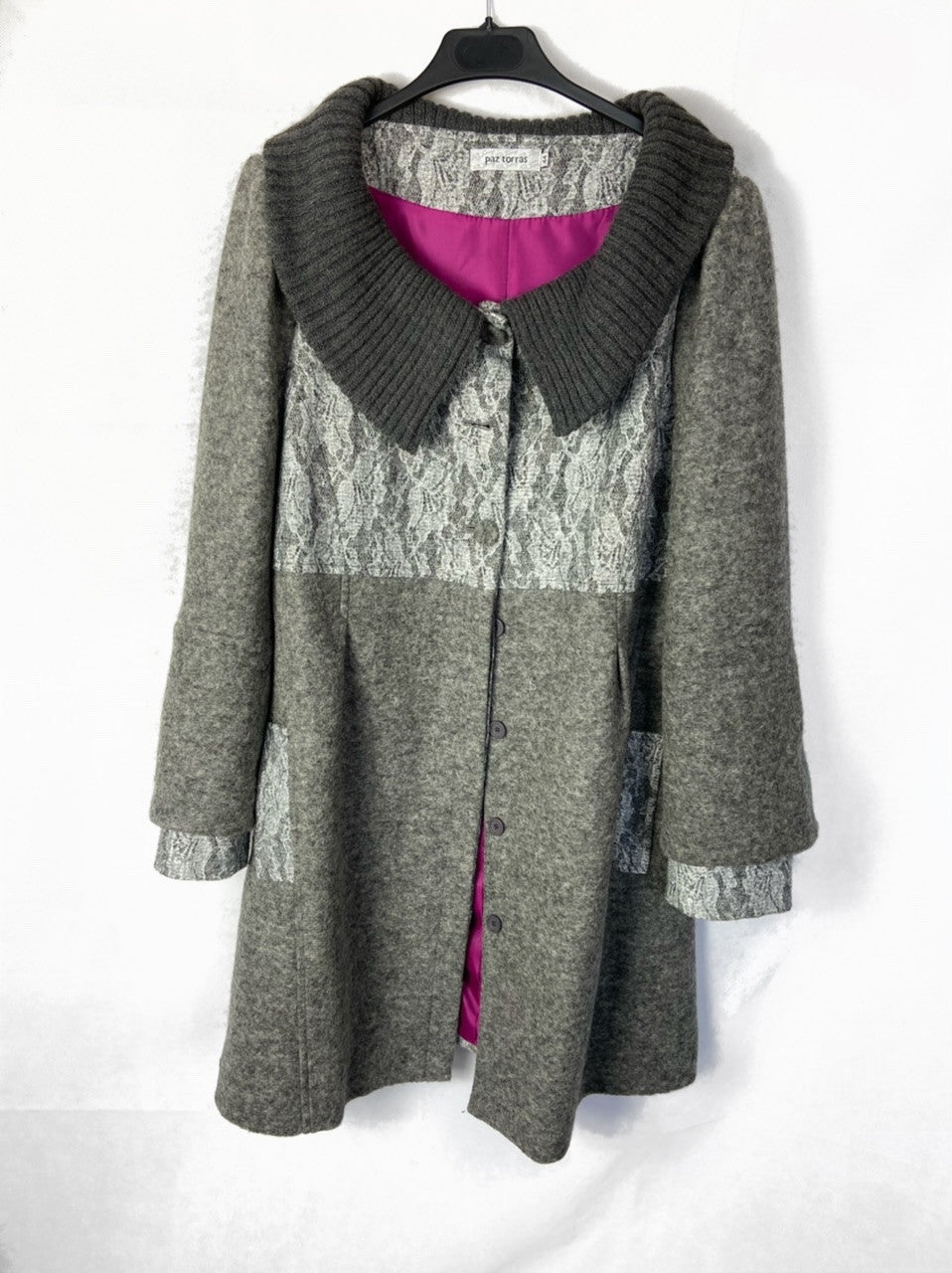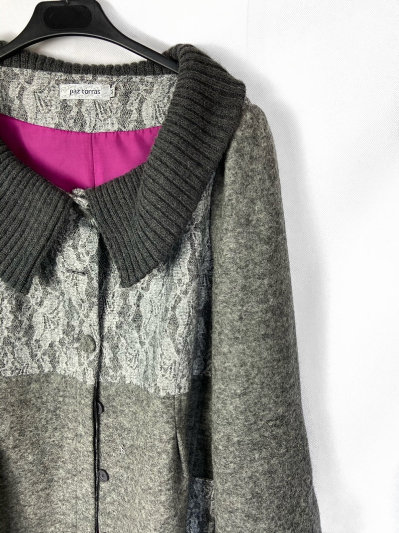 Abrigo gris con detalles de encaje en tono blanco, el cuello es amplio y de punto. Largo 93 cm
