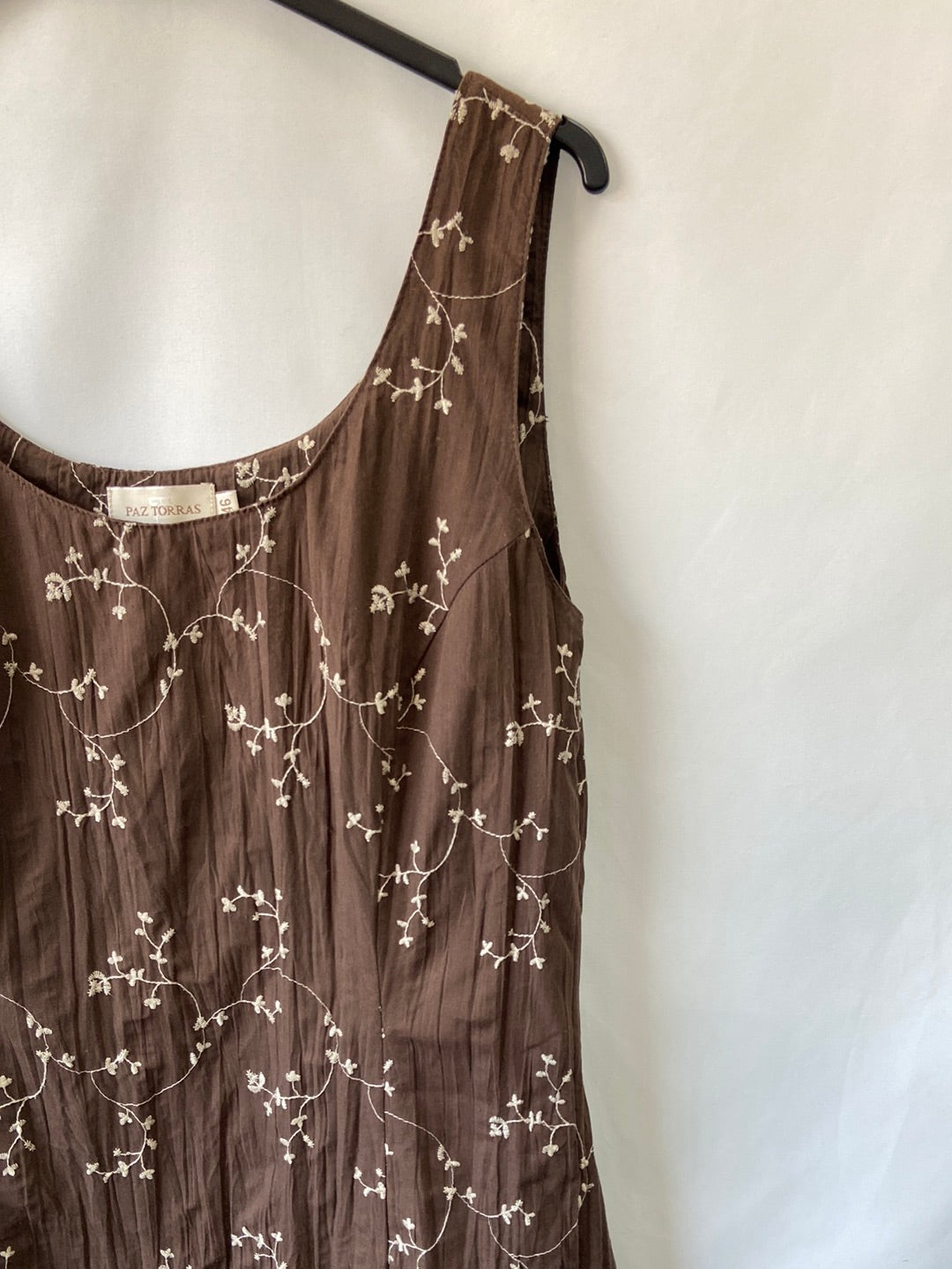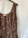 Vestido marrón con flores blancas. el tejido es rugoso y la parte de abajo tiene un volante. De sisa a sisa 49 cm, largo 103 cm