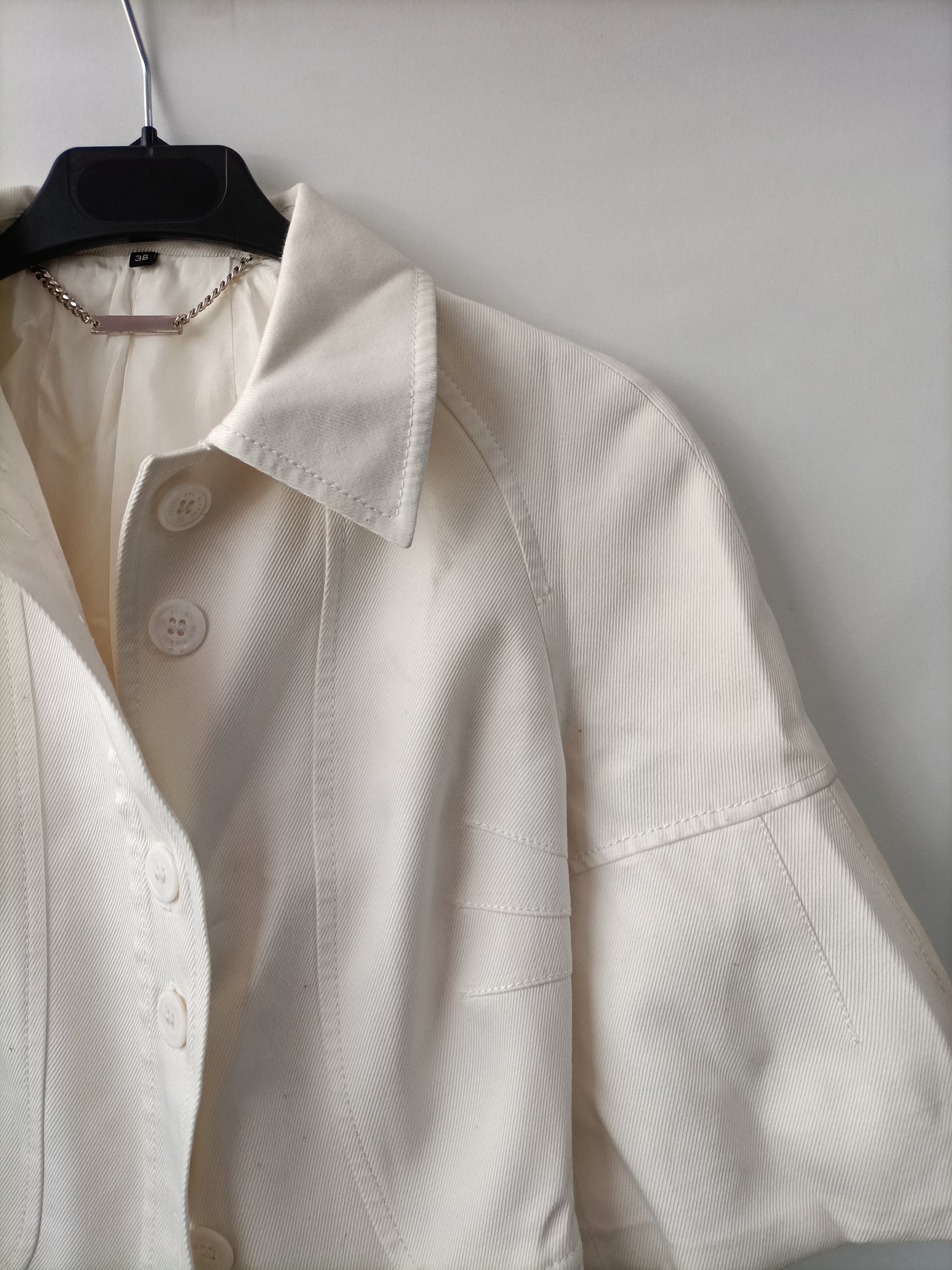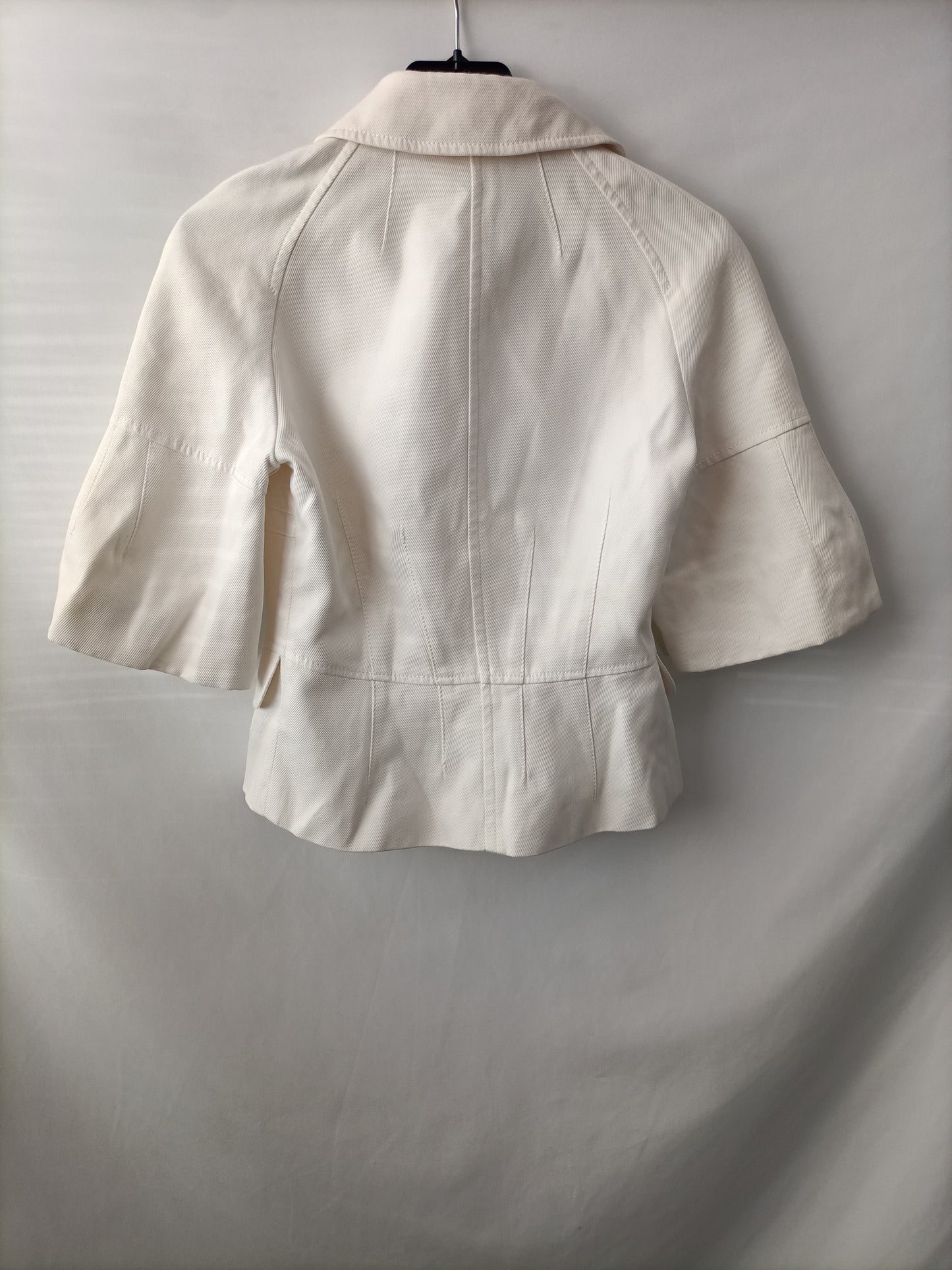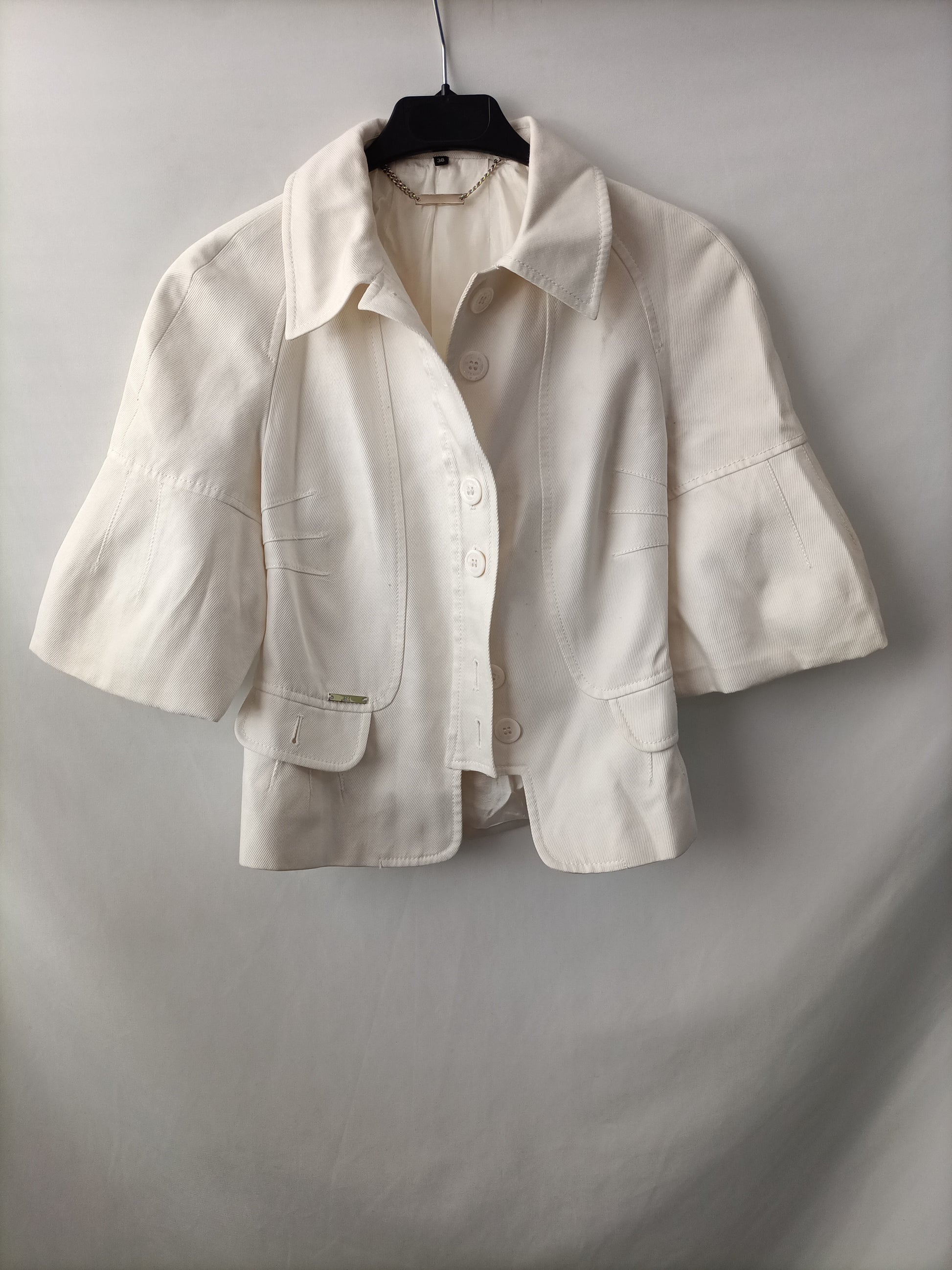 Cazadora blanca cortita con las mangas 3/4 abombadas y tejido vaquero.