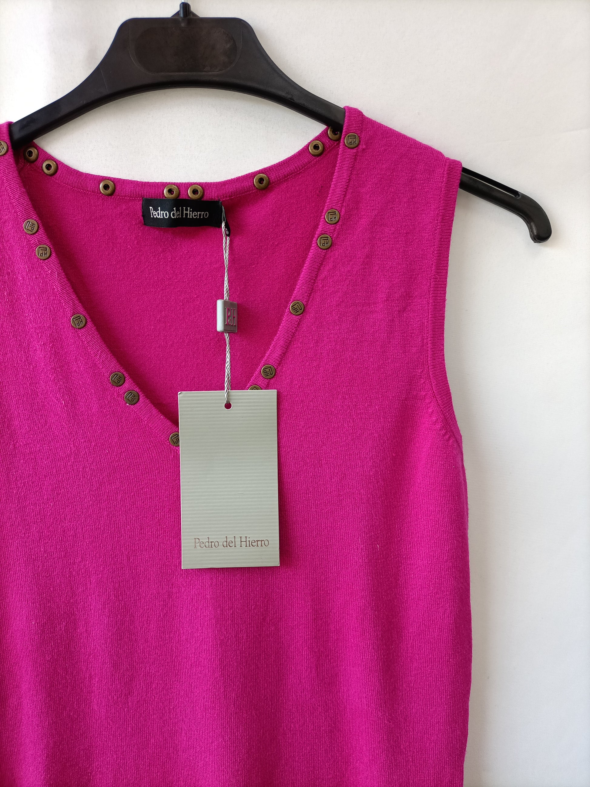 Pedro del hierro. NUEVO CON ETIQUETA. Too de punto rosa fucsia con tachuelas en el escote. Elástico. Largo 59 cm