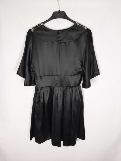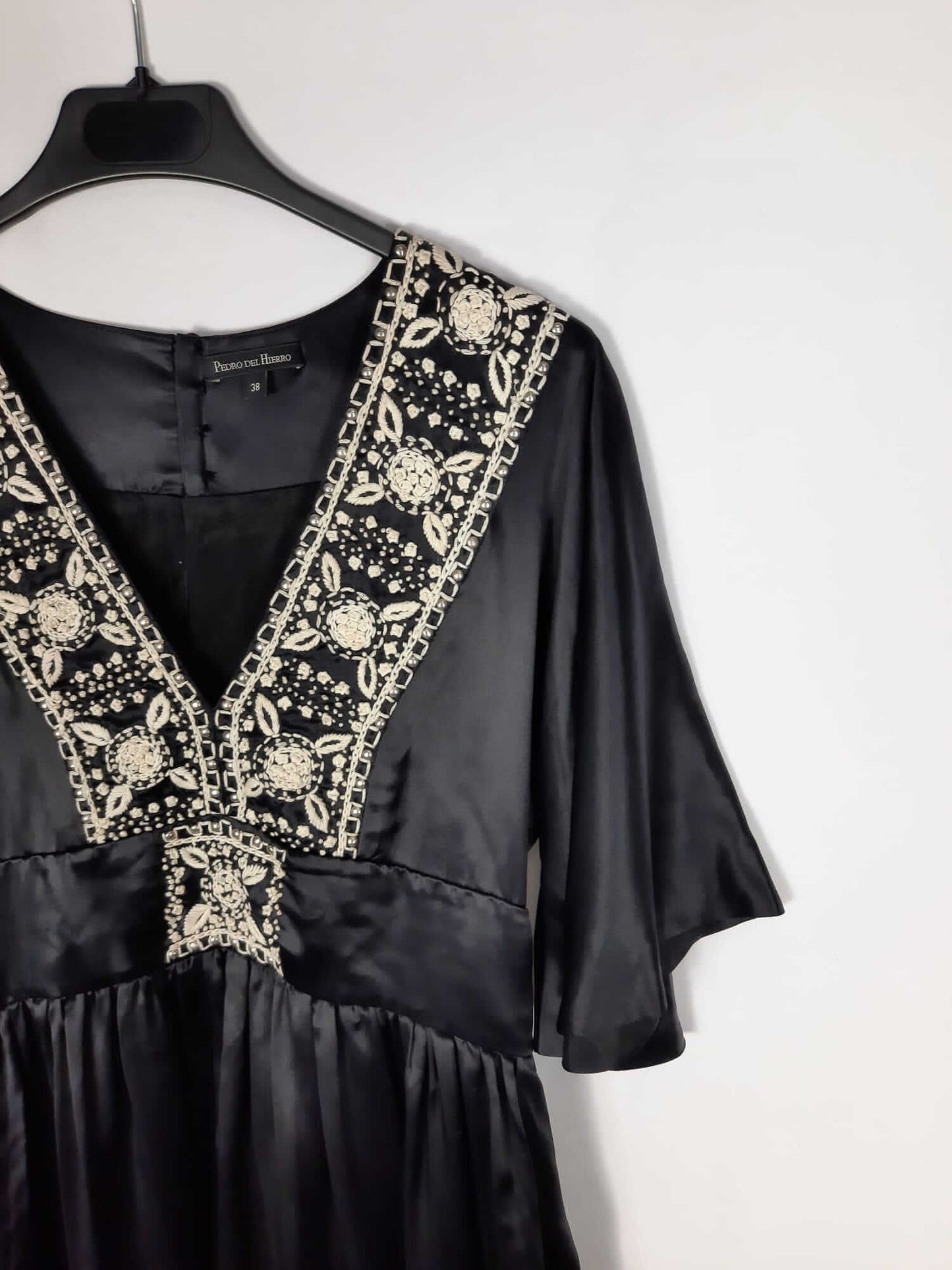 Pedro del hierro. Vestido corto negro de raso con escote bordado. Mangas fluidas, corte en la cintura. No elástico. De sisa a sisa 44 cm largo 88 cm