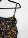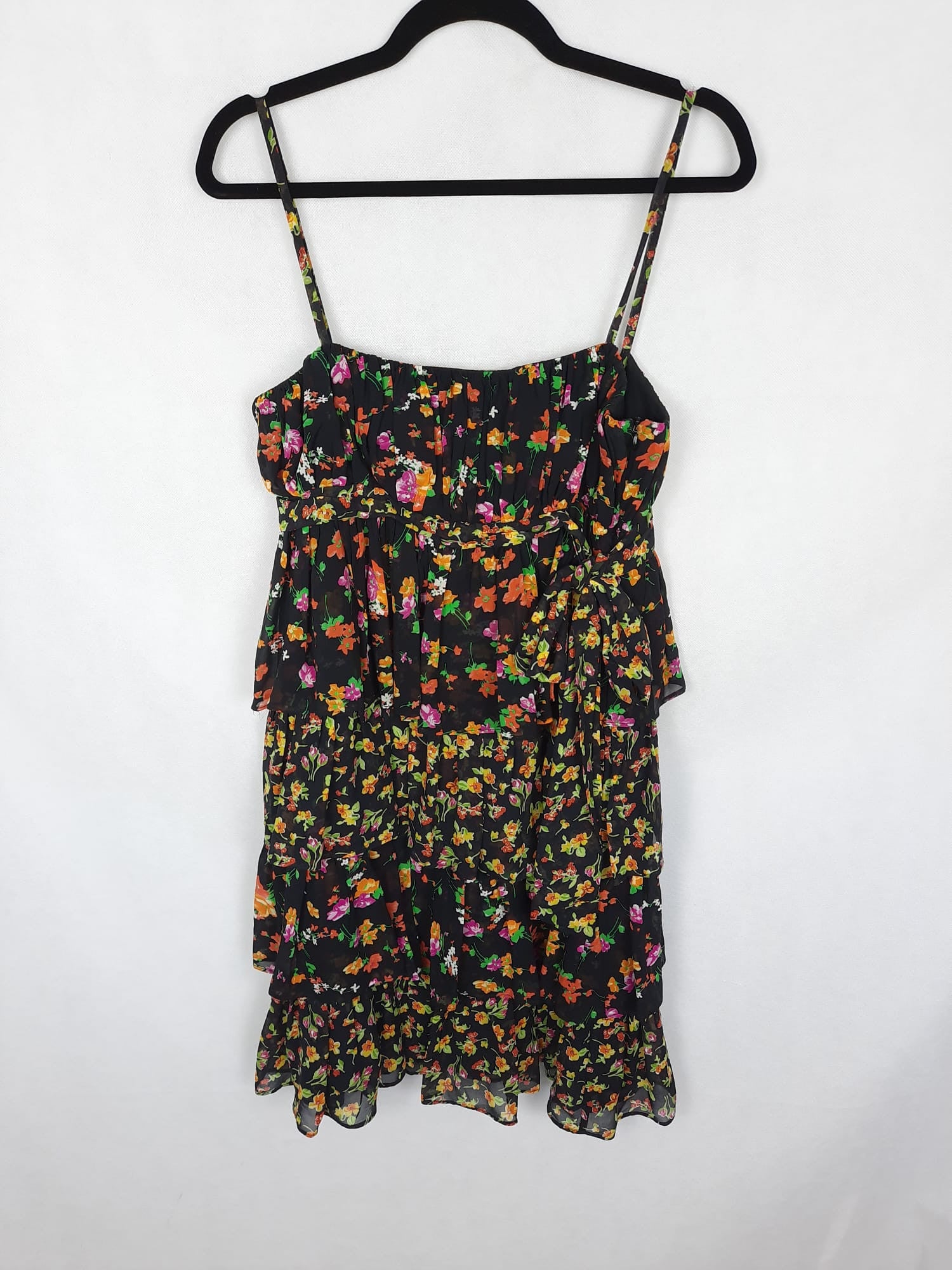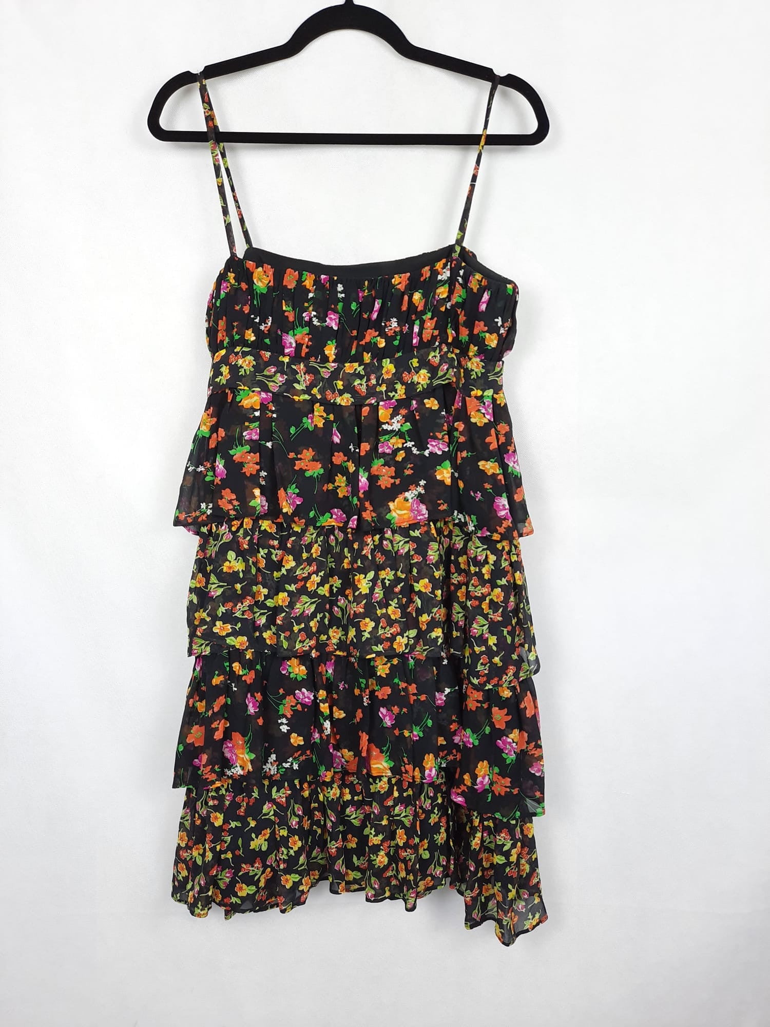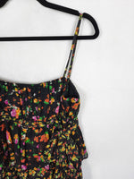 Vestido negro con flores, parte del escote fruncida y abajo con volantes. Es fluido. No es elástico. De sisa a sisa 44 cm largo 98 cm
