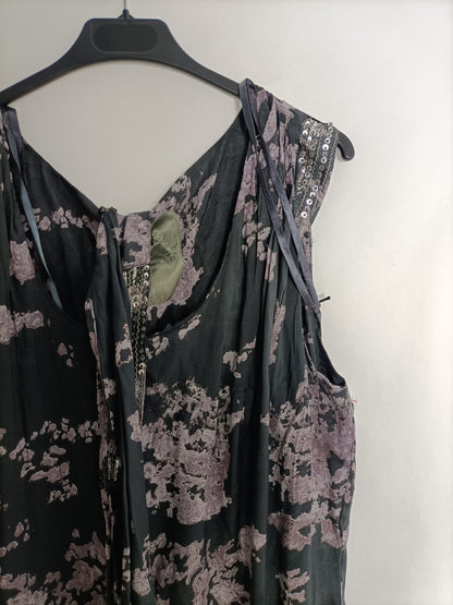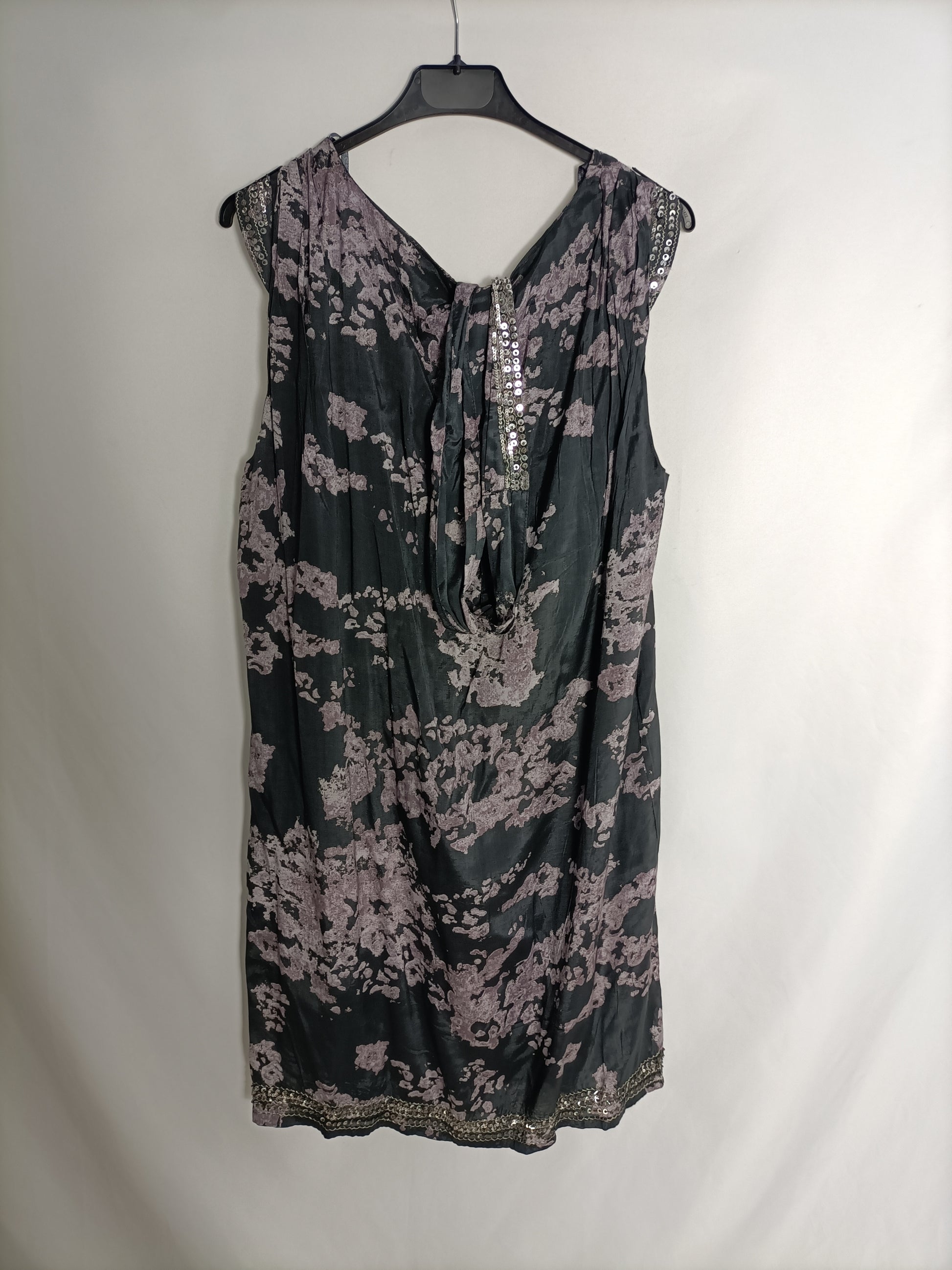NUEVO CON ETIQUETA. Vestido estampado de flores gris y morado con detalle de lentejuelas y fajín