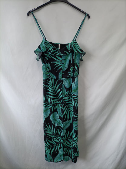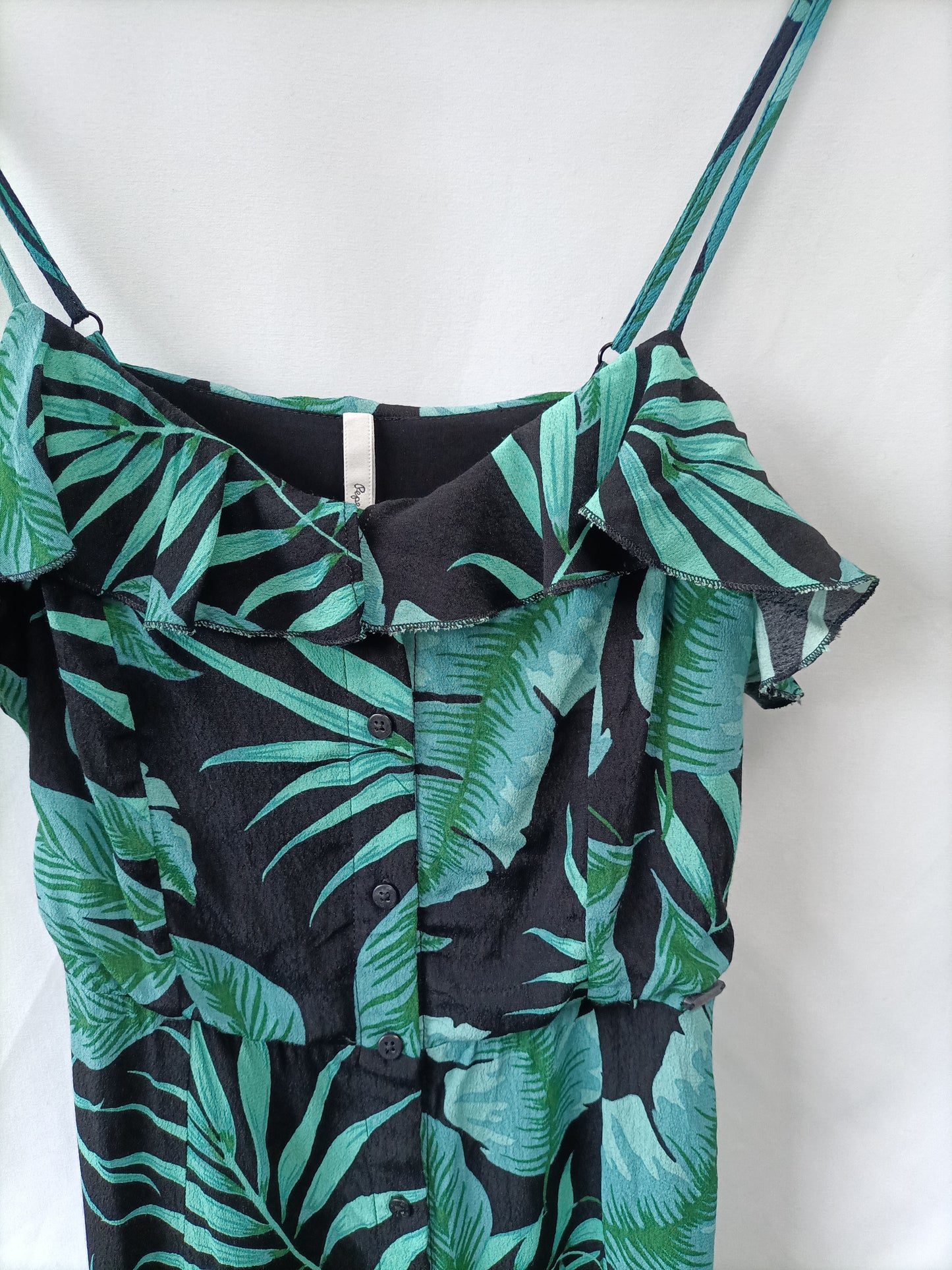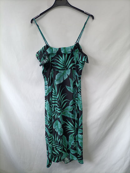 Vestido midi negro con hojas en tonos verdes. Tirantes ajustables. No elástico. Abotonado. De sisa a sisa 43 cm largo 109 cm