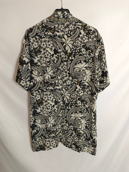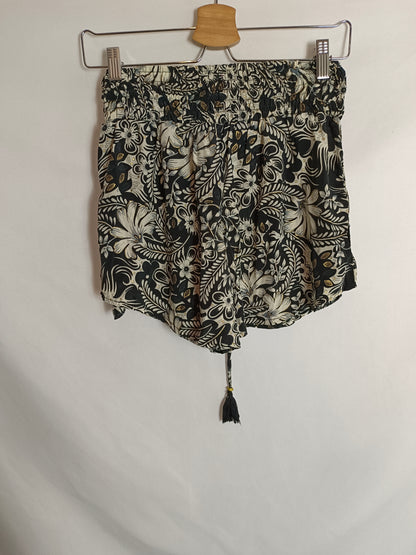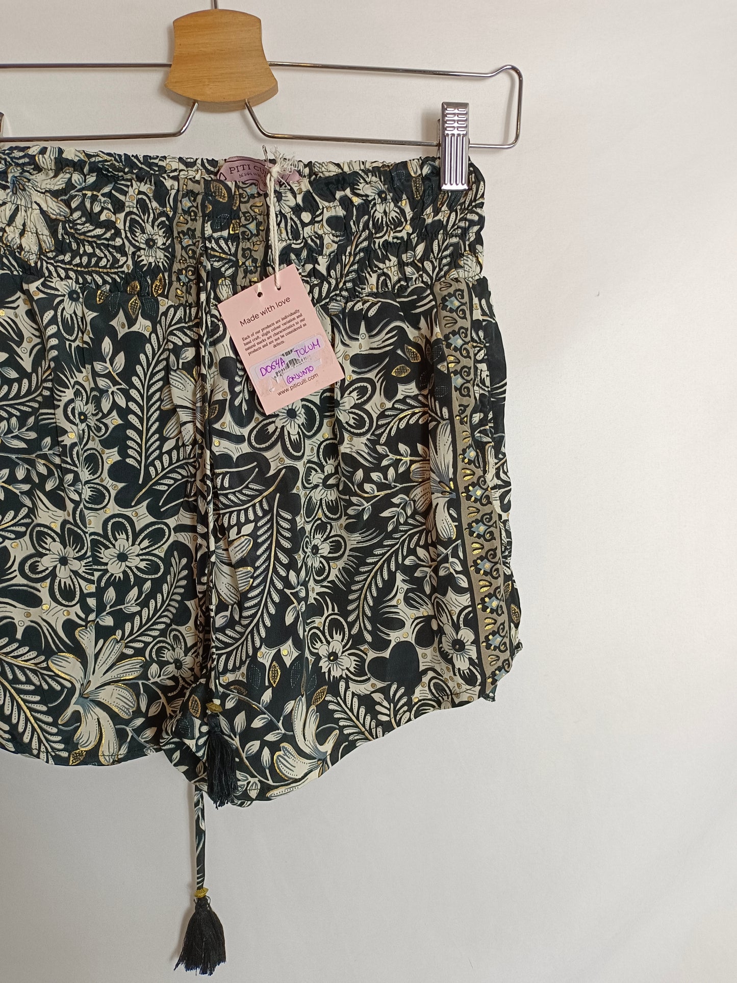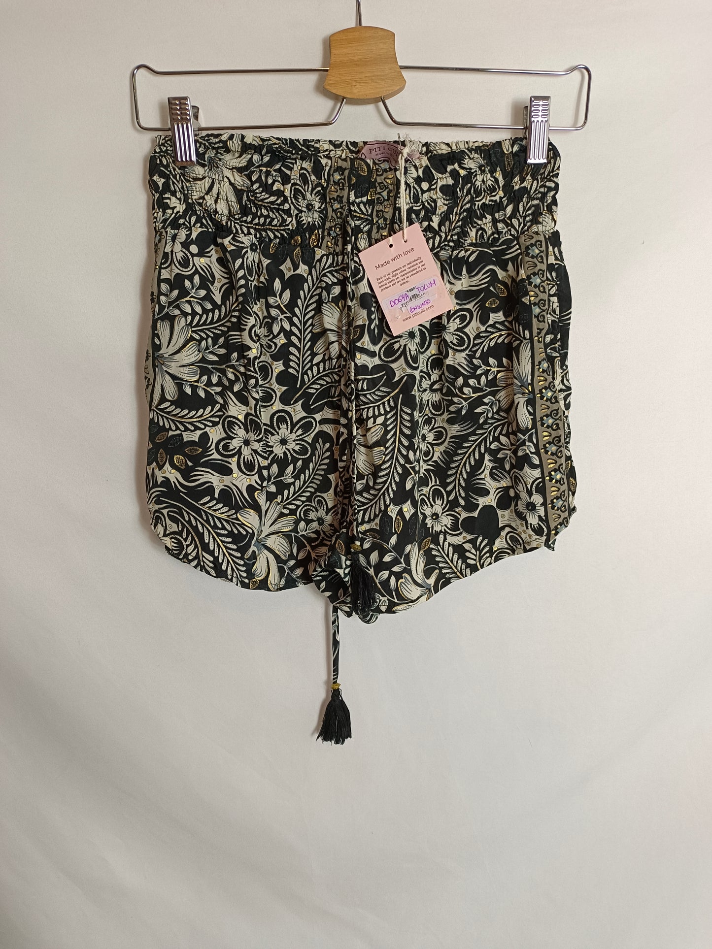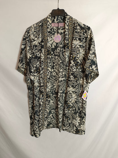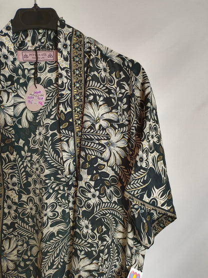 UEVO CON ETIQUETA. total look fluido de kimono y pantalón corto negro con flores.