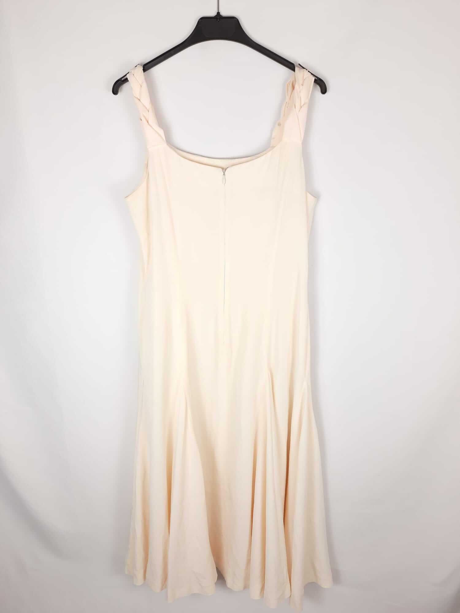 Pilar sanjuan. Vestido midi beige fluido y con vuelo. Tirantes trenzados. No elástico. De sisa a sisa 47 cm largo 122 cm