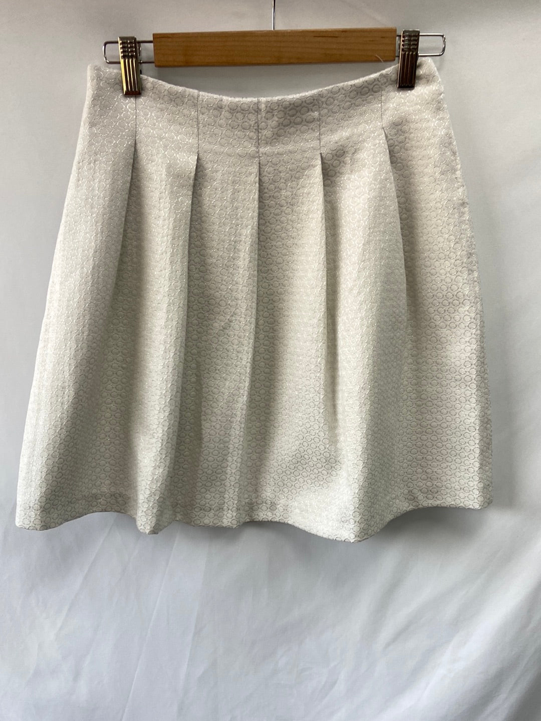 falda corta vuelo tableada. No elástica. Cintura de 38 cm. Cremallera trasera. Largo 47 cm.