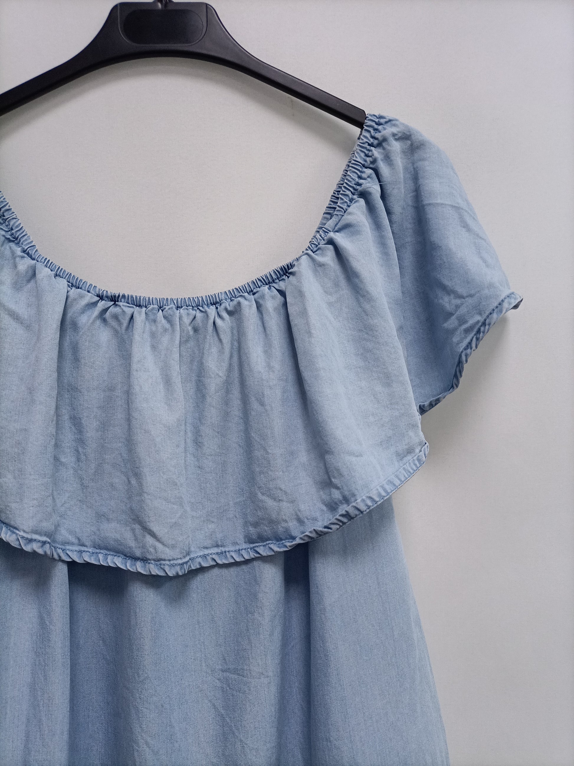 vestido corto denim fluido con volante en el escote. Largo 75 cm